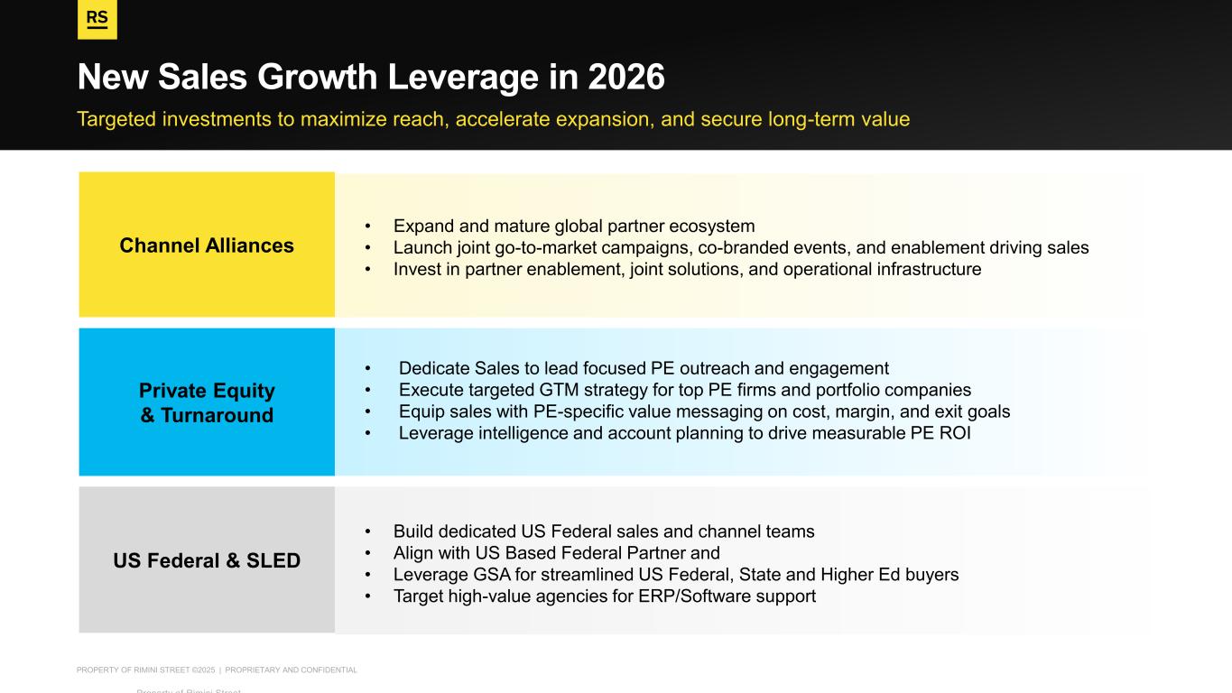 PROPERTY OF RIMINI STREET ©2025 | PROPRIETARY AND CONFIDENTIAL Targeted investments to maximize reach, accelerate expansion, and secure long-term value New Sales Growth Leverage in 2026 Property of Rimini Street ©2025 • Build dedicated US Federal sales and channel teams • Align with US Based Federal Partner and • Leverage GSA for streamlined US Federal, State and Higher Ed buyers • Target high-value agencies for ERP/Software support • Expand and mature global partner ecosystem • Launch joint go-to-market campaigns, co-branded events, and enablement driving sales • Invest in partner enablement, joint solutions, and operational infrastructure • Dedicate Sales to lead focused PE outreach and engagement • Execute targeted GTM strategy for top PE firms and portfolio companies • Equip sales with PE-specific value messaging on cost, margin, and exit goals • Leverage intelligence and account planning to drive measurable PE ROI US Federal & SLED Private Equity & Turnaround Channel Alliances