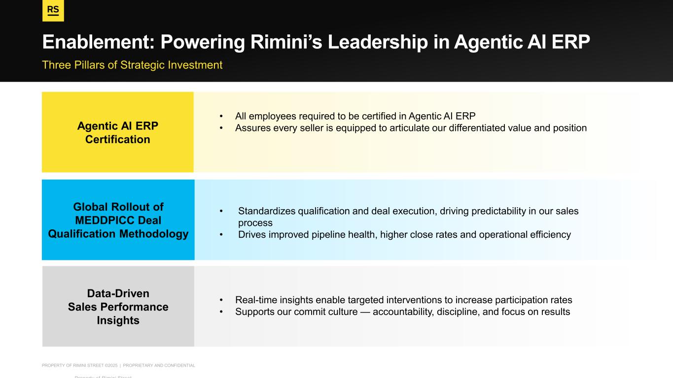 PROPERTY OF RIMINI STREET ©2025 | PROPRIETARY AND CONFIDENTIAL Three Pillars of Strategic Investment Enablement: Powering Rimini’s Leadership in Agentic AI ERP Property of Rimini Street ©2025 • Real-time insights enable targeted interventions to increase participation rates • Supports our commit culture — accountability, discipline, and focus on results • All employees required to be certified in Agentic AI ERP • Assures every seller is equipped to articulate our differentiated value and position • Standardizes qualification and deal execution, driving predictability in our sales process • Drives improved pipeline health, higher close rates and operational efficiency Data-Driven Sales Performance Insights Global Rollout of MEDDPICC Deal Qualification Methodology Agentic AI ERP Certification