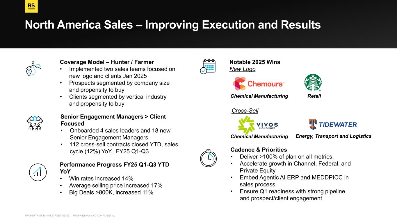 PROPERTY OF RIMINI STREET ©2025 | PROPRIETARY AND CONFIDENTIAL North America Sales – Improving Execution and Results Coverage Model – Hunter / Farmer • Implemented two sales teams focused on new logo and clients Jan 2025 • Prospects segmented by company size and propensity to buy • Clients segmented by vertical industry and propensity to buy Senior Engagement Managers > Client Focused • Onboarded 4 sales leaders and 18 new Senior Engagement Managers • 112 cross-sell contracts closed YTD, sales cycle (12%) YoY, FY25 Q1-Q3 Performance Progress FY25 Q1-Q3 YTD YoY • Win rates increased 14% • Average selling price increased 17% • Big Deals >800K, increased 11% Notable 2025 Wins New Logo Cross-Sell Cadence & Priorities • Deliver >100% of plan on all metrics. • Accelerate growth in Channel, Federal, and Private Equity • Embed Agentic AI ERP and MEDDPICC in sales process. • Ensure Q1 readiness with strong pipeline and prospect/client engagement Chemical Manufacturing Retail Chemical Manufacturing Energy, Transport and Logistics
