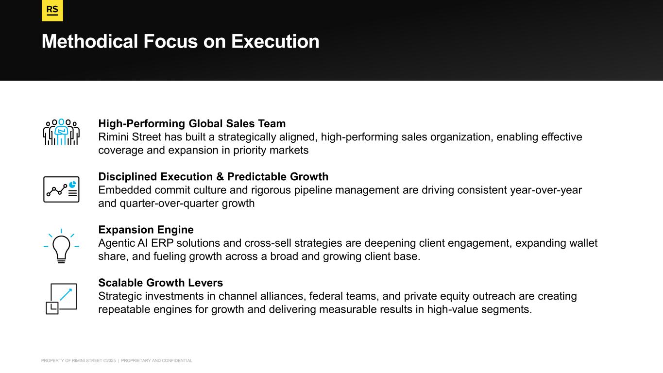 PROPERTY OF RIMINI STREET ©2025 | PROPRIETARY AND CONFIDENTIAL Methodical Focus on Execution High-Performing Global Sales Team Rimini Street has built a strategically aligned, high-performing sales organization, enabling effective coverage and expansion in priority markets Disciplined Execution & Predictable Growth Embedded commit culture and rigorous pipeline management are driving consistent year-over-year and quarter-over-quarter growth Expansion Engine Agentic AI ERP solutions and cross-sell strategies are deepening client engagement, expanding wallet share, and fueling growth across a broad and growing client base. Scalable Growth Levers Strategic investments in channel alliances, federal teams, and private equity outreach are creating repeatable engines for growth and delivering measurable results in high-value segments.