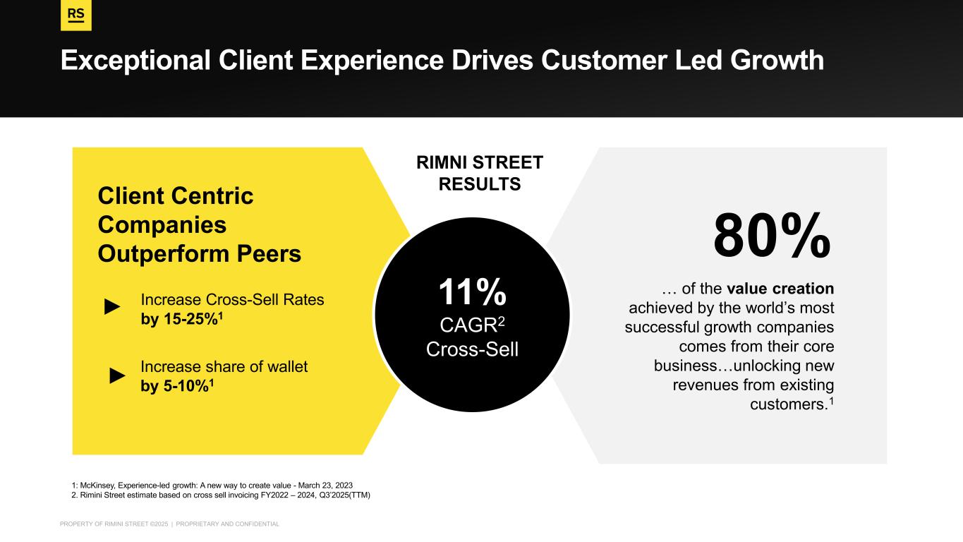 PROPERTY OF RIMINI STREET ©2025 | PROPRIETARY AND CONFIDENTIAL Exceptional Client Experience Drives Customer Led Growth 1: McKinsey, Experience-led growth: A new way to create value - March 23, 2023 2. Rimini Street estimate based on cross sell invoicing FY2022 – 2024, Q3’2025(TTM) Increase Cross-Sell Rates by 15-25%1 Increase share of wallet by 5-10%1 RIMNI STREET RESULTS … of the value creation achieved by the world’s most successful growth companies comes from their core business…unlocking new revenues from existing customers.1 Client Centric Companies Outperform Peers 80% 11% CAGR2 Cross-Sell