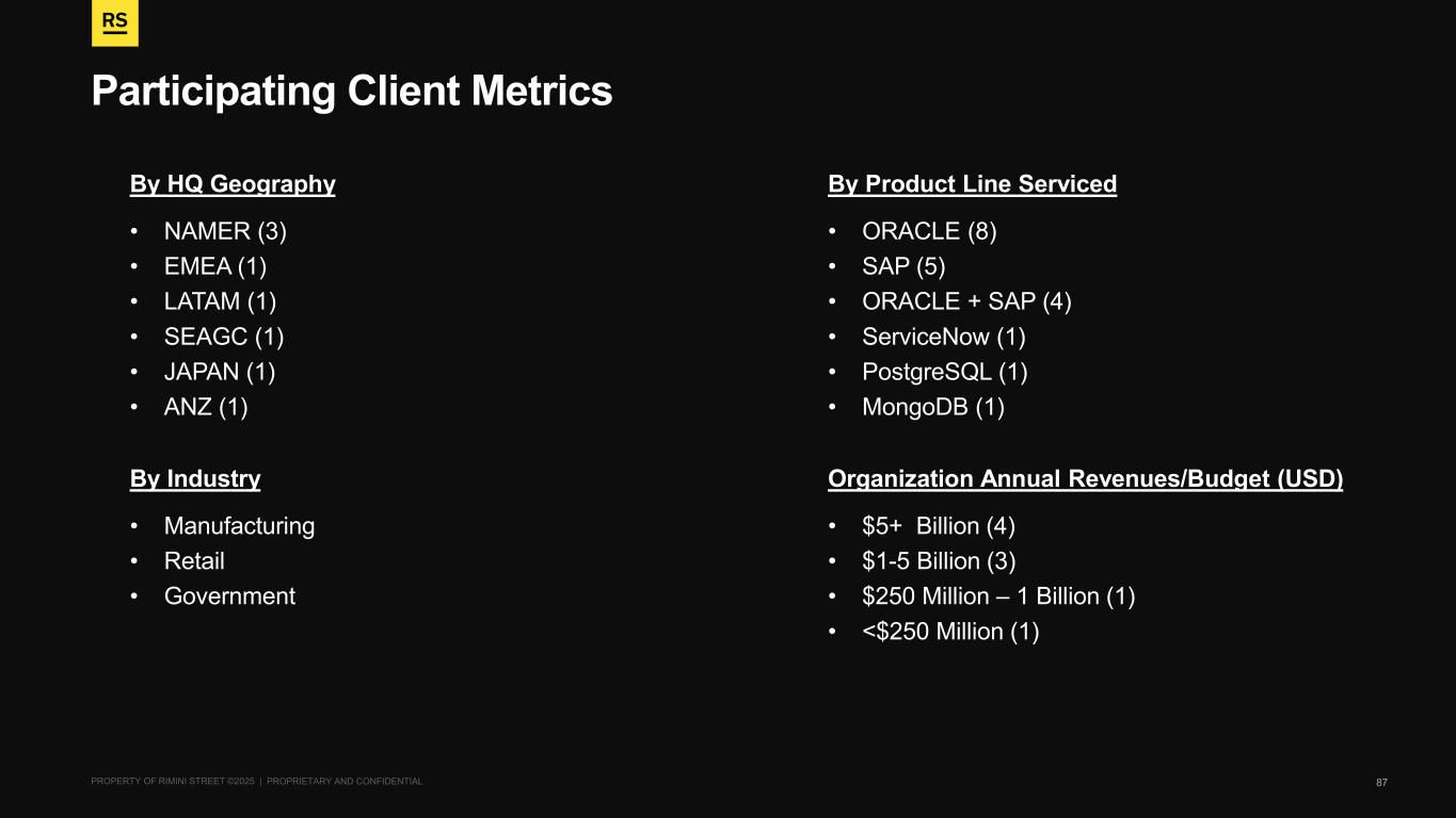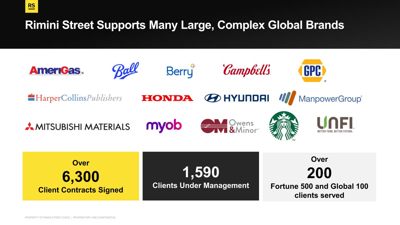 PROPERTY OF RIMINI STREET ©2025 | PROPRIETARY AND CONFIDENTIAL Rimini Street Supports Many Large, Complex Global Brands Over 200 Fortune 500 and Global 100 clients served 1,590 Clients Under Management Over 6,300 Client Contracts Signed