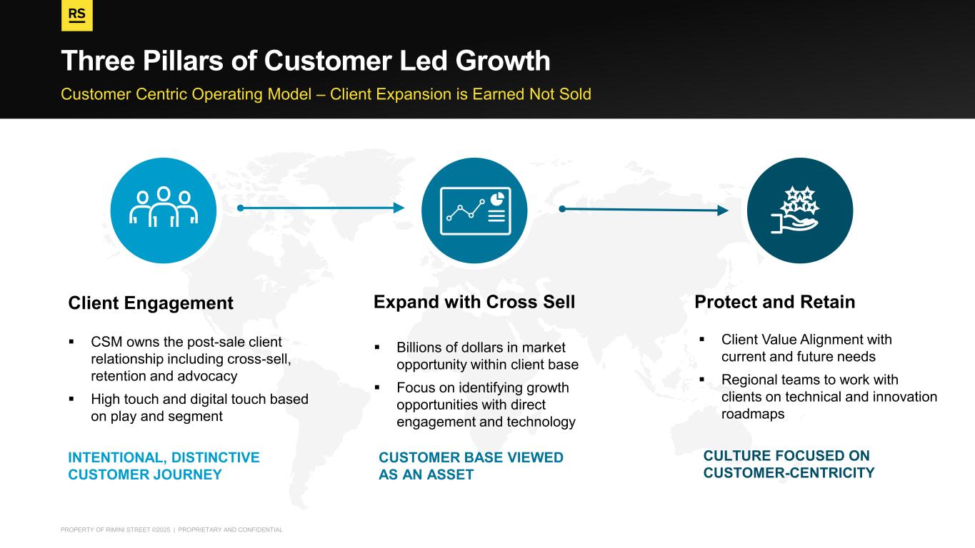 PROPERTY OF RIMINI STREET ©2025 | PROPRIETARY AND CONFIDENTIAL Customer Centric Operating Model – Client Expansion is Earned Not Sold Three Pillars of Customer Led Growth ▪ CSM owns the post-sale client relationship including cross-sell, retention and advocacy ▪ High touch and digital touch based on play and segment Client Engagement ▪ Billions of dollars in market opportunity within client base ▪ Focus on identifying growth opportunities with direct engagement and technology Expand with Cross Sell CUSTOMER BASE VIEWED AS AN ASSET INTENTIONAL, DISTINCTIVE CUSTOMER JOURNEY ▪ Client Value Alignment with current and future needs ▪ Regional teams to work with clients on technical and innovation roadmaps Protect and Retain CULTURE FOCUSED ON CUSTOMER-CENTRICITY