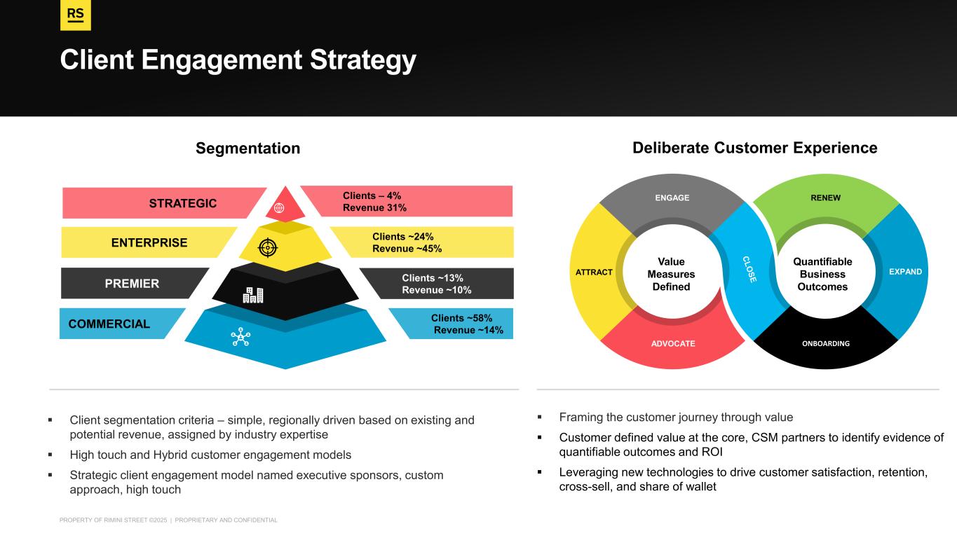 PROPERTY OF RIMINI STREET ©2025 | PROPRIETARY AND CONFIDENTIAL Client Engagement Strategy STRATEGIC Clients – 4% Revenue 31% ENTERPRISE Clients ~24% Revenue ~45% PREMIER Clients ~13% Revenue ~10% COMMERCIAL Clients ~58% Revenue ~14% ENGAGE ADVOCATE RENEW ONBOARDING EXPANDATTRACT Segmentation Deliberate Customer Experience ▪ Client segmentation criteria – simple, regionally driven based on existing and potential revenue, assigned by industry expertise ▪ High touch and Hybrid customer engagement models ▪ Strategic client engagement model named executive sponsors, custom approach, high touch ▪ Framing the customer journey through value ▪ Customer defined value at the core, CSM partners to identify evidence of quantifiable outcomes and ROI ▪ Leveraging new technologies to drive customer satisfaction, retention, cross-sell, and share of wallet Value Measures Defined Quantifiable Business Outcomes