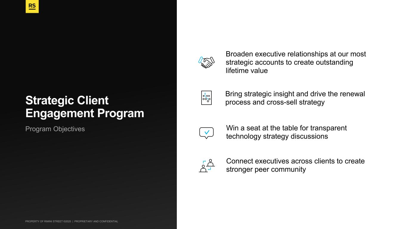 PROPERTY OF RIMINI STREET ©2025 | PROPRIETARY AND CONFIDENTIAL Program Objectives Strategic Client Engagement Program Broaden executive relationships at our most strategic accounts to create outstanding lifetime value Bring strategic insight and drive the renewal process and cross-sell strategy Win a seat at the table for transparent technology strategy discussions Connect executives across clients to create stronger peer community