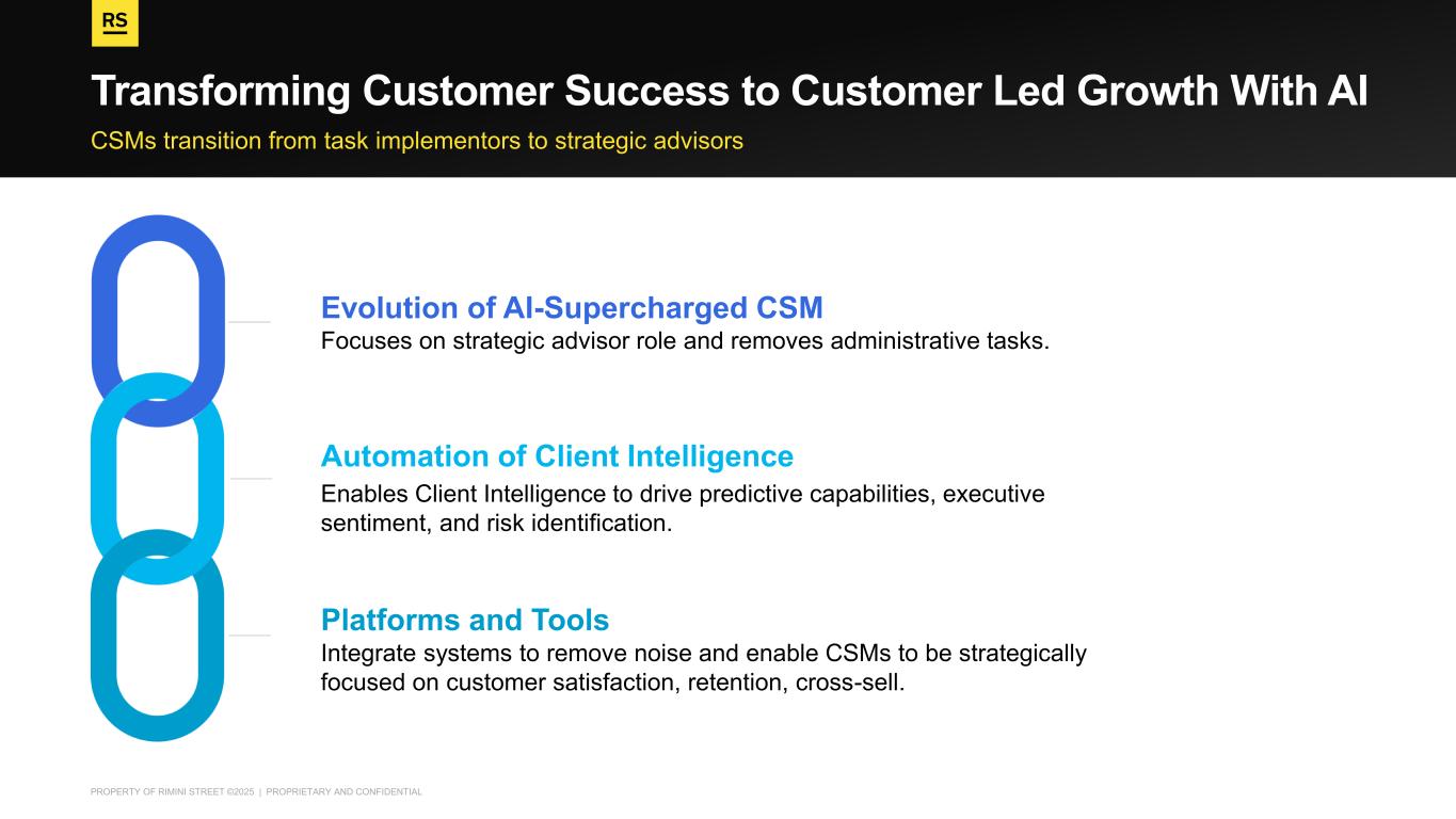 PROPERTY OF RIMINI STREET ©2025 | PROPRIETARY AND CONFIDENTIAL CSMs transition from task implementors to strategic advisors​ Transforming Customer Success to Customer Led Growth With AI Automation of Client Intelligence Enables Client Intelligence to drive predictive capabilities, executive sentiment, and risk identification. Evolution of AI-Supercharged CSM Focuses on strategic advisor role and removes administrative tasks. Platforms and Tools Integrate systems to remove noise and enable CSMs to be strategically focused on customer satisfaction, retention, cross-sell.