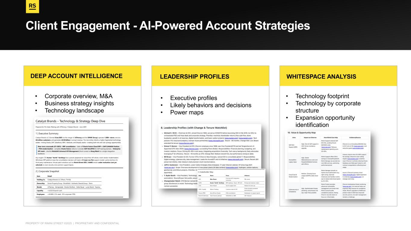 PROPERTY OF RIMINI STREET ©2025 | PROPRIETARY AND CONFIDENTIAL Client Engagement - AI-Powered Account Strategies • Executive profiles • Likely behaviors and decisions • Power maps LEADERSHIP PROFILES • Technology footprint • Technology by corporate structure • Expansion opportunity identification WHITESPACE ANALYSIS • Corporate overview, M&A • Business strategy insights • Technology landscape DEEP ACCOUNT INTELLIGENCE