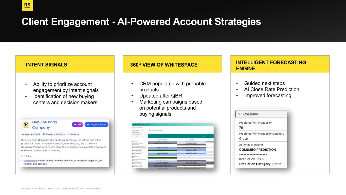 PROPERTY OF RIMINI STREET ©2025 | PROPRIETARY AND CONFIDENTIAL Client Engagement - AI-Powered Account Strategies • Ability to prioritize account engagement by intent signals • Identification of new buying centers and decision makers INTENT SIGNALS • CRM populated with probable products • Updated after QBR • Marketing campaigns based on potential products and buying signals 360O VIEW OF WHITESPACE • Guided next steps • AI Close Rate Prediction • Improved forecasting INTELLIGENT FORECASTING ENGINE