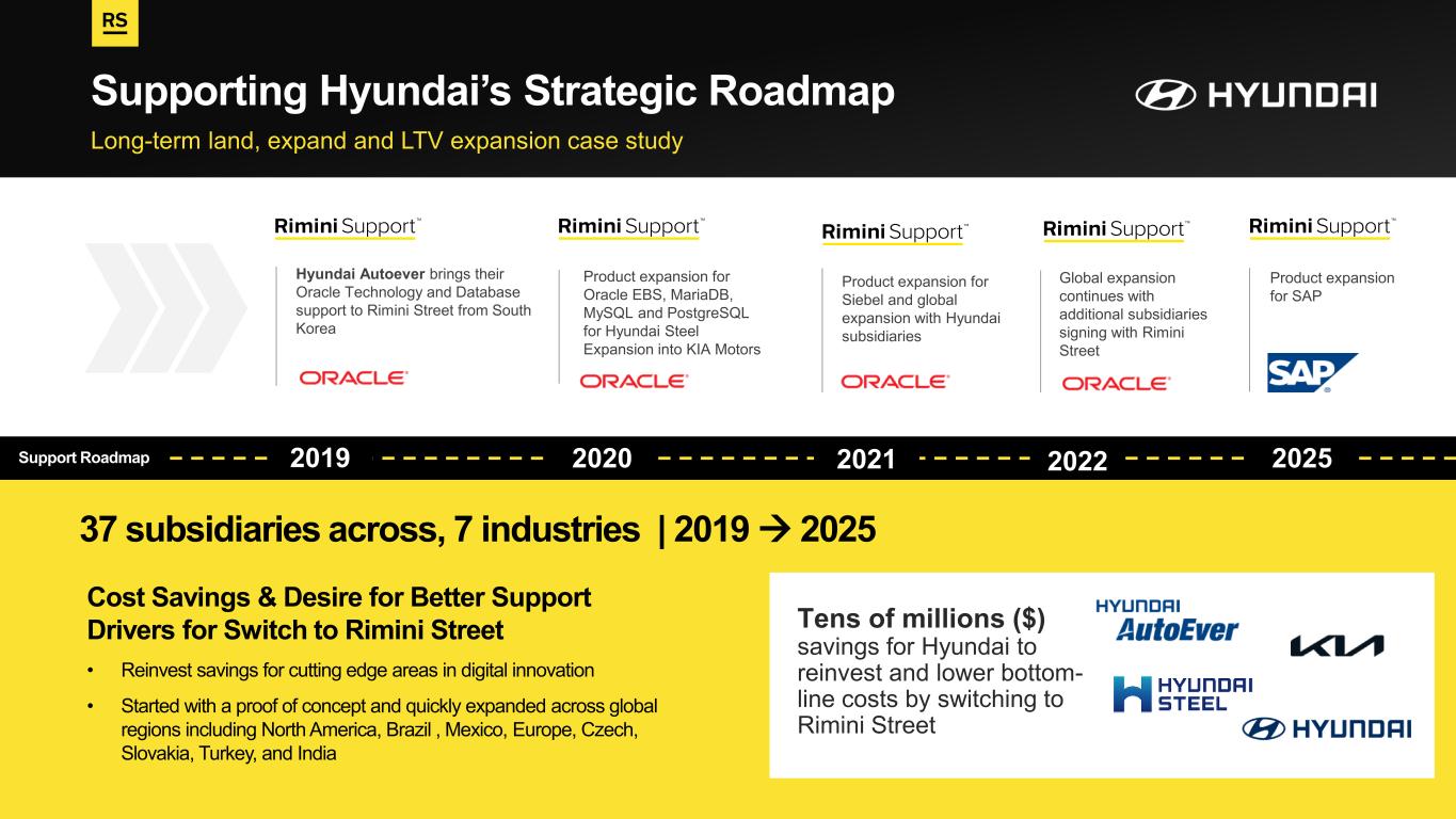 PROPERTY OF RIMINI STREET ©2025 | PROPRIETARY AND CONFIDENTIAL Support Roadmap Long-term land, expand and LTV expansion case study Supporting Hyundai’s Strategic Roadmap 2020 2021 20222019 37 subsidiaries across, 7 industries | 2019 → 2025 2025 Hyundai Autoever brings their Oracle Technology and Database support to Rimini Street from South Korea Product expansion for Siebel and global expansion with Hyundai subsidiaries Global expansion continues with additional subsidiaries signing with Rimini Street Product expansion for SAP Product expansion for Oracle EBS, MariaDB, MySQL and PostgreSQL for Hyundai Steel Expansion into KIA Motors Cost Savings & Desire for Better Support Drivers for Switch to Rimini Street • Reinvest savings for cutting edge areas in digital innovation • Started with a proof of concept and quickly expanded across global regions including North America, Brazil , Mexico, Europe, Czech, Slovakia, Turkey, and India Tens of millions ($) savings for Hyundai to reinvest and lower bottom- line costs by switching to Rimini Street