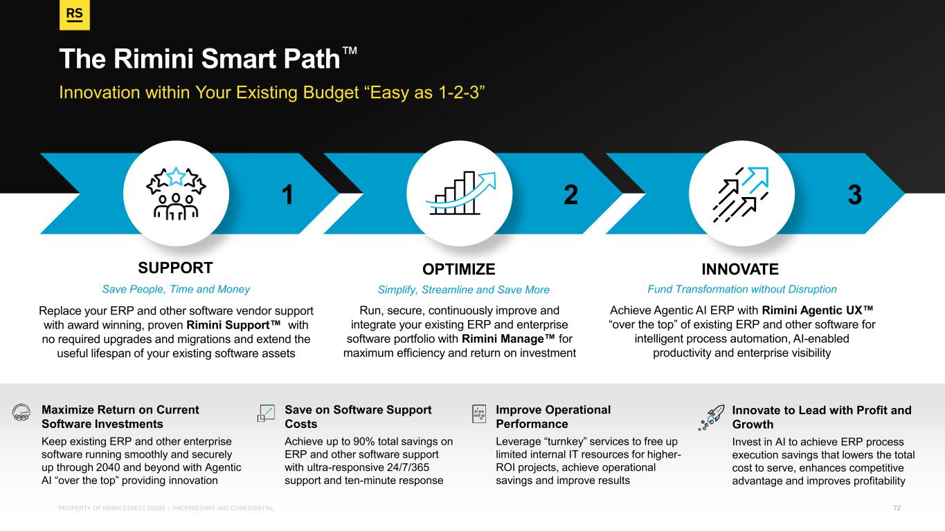 PROPERTY OF RIMINI STREET ©2025 | PROPRIETARY AND CONFIDENTIAL Innovation within Your Existing Budget “Easy as 1-2-3” The Rimini Smart Path Replace your ERP and other software vendor support with award winning, proven Rimini Support with no required upgrades and migrations and extend the useful lifespan of your existing software assets Run, secure, continuously improve and integrate your existing ERP and enterprise software portfolio with Rimini Manage for maximum efficiency and return on investment Achieve Agentic AI ERP with Rimini Agentic UX “over the top” of existing ERP and other software for intelligent process automation, AI-enabled productivity and enterprise visibility SUPPORT OPTIMIZE INNOVATE Save People, Time and Money Simplify, Streamline and Save More Fund Transformation without Disruption 1 32 Maximize Return on Current Software Investments Keep existing ERP and other enterprise software running smoothly and securely up through 2040 and beyond with Agentic AI “over the top” providing innovation Save on Software Support Costs Achieve up to 90% total savings on ERP and other software support with ultra-responsive 24/7/365 support and ten-minute response Improve Operational Performance Leverage “turnkey” services to free up limited internal IT resources for higher- ROI projects, achieve operational savings and improve results Innovate to Lead with Profit and Growth Invest in AI to achieve ERP process execution savings that lowers the total cost to serve, enhances competitive advantage and improves profitability 72