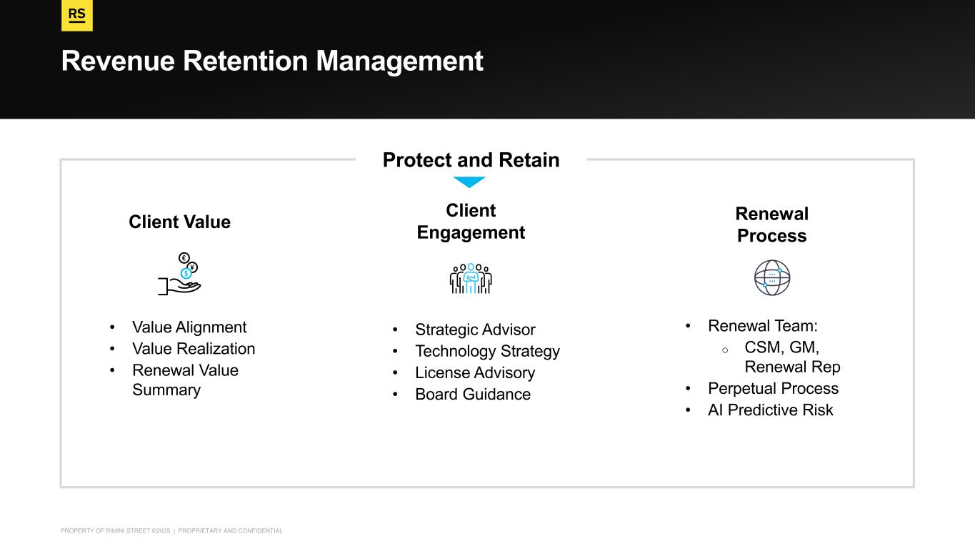 PROPERTY OF RIMINI STREET ©2025 | PROPRIETARY AND CONFIDENTIAL Revenue Retention Management • Value Alignment • Value Realization • Renewal Value Summary • Strategic Advisor • Technology Strategy • License Advisory • Board Guidance • Renewal Team: o CSM, GM, Renewal Rep • Perpetual Process • AI Predictive Risk Protect and Retain Client Value Client Engagement Renewal Process
