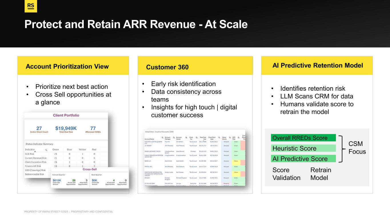 PROPERTY OF RIMINI STREET ©2025 | PROPRIETARY AND CONFIDENTIAL Protect and Retain ARR Revenue - At Scale Account Prioritization View Customer 360 AI Predictive Retention Model • Identifies retention risk • LLM Scans CRM for data • Humans validate score to retrain the model • Early risk identification • Data consistency across teams • Insights for high touch | digital customer success • Prioritize next best action • Cross Sell opportunities at a glance Overall RREDs Score Heuristic Score AI Predictive Score Score Validation Retrain Model CSM Focus