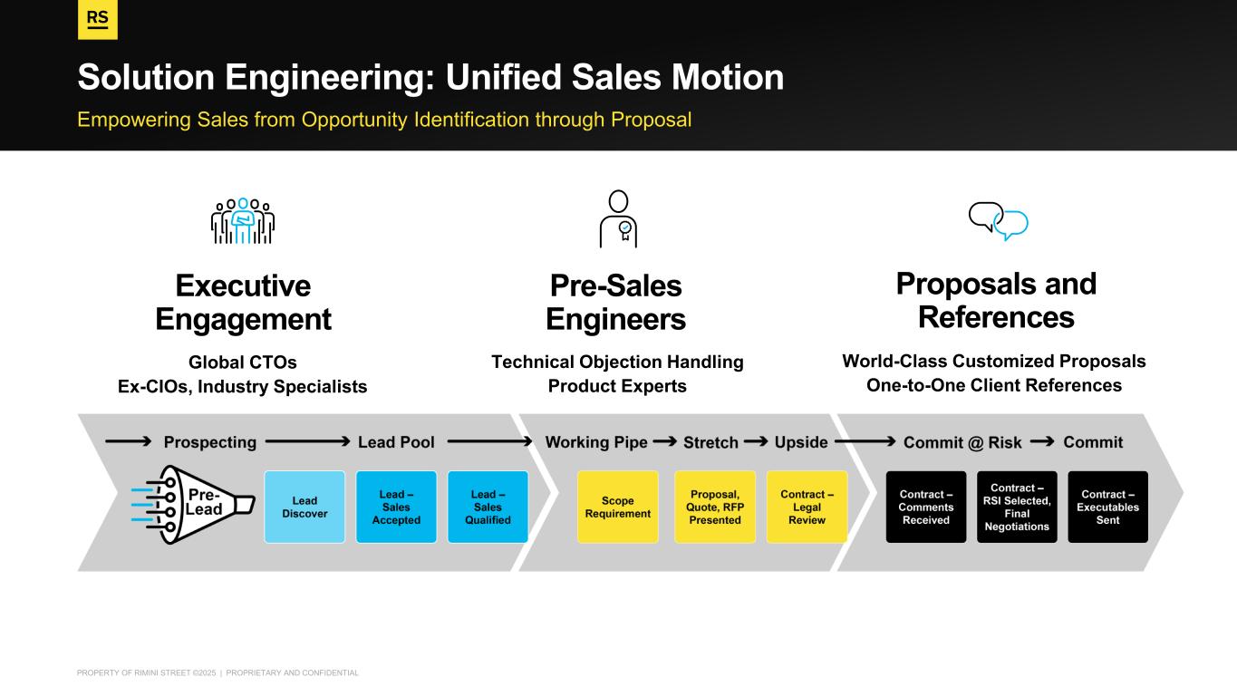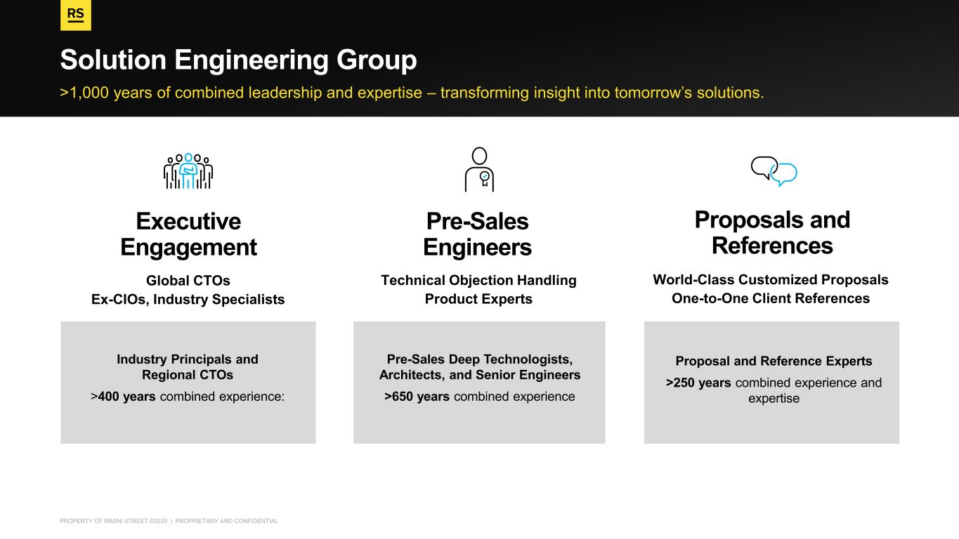 PROPERTY OF RIMINI STREET ©2025 | PROPRIETARY AND CONFIDENTIAL Empowering Sales from Opportunity Identification through Proposal Solution Engineering: Unified Sales Motion Global CTOs Ex-CIOs, Industry Specialists Executive Engagement Technical Objection Handling Product Experts Pre-Sales Engineers World-Class Customized Proposals One-to-One Client References Proposals and References