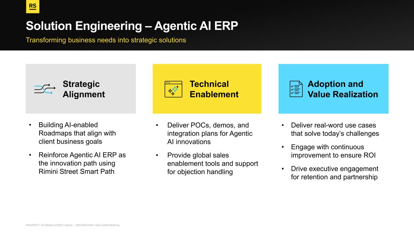 PROPERTY OF RIMINI STREET ©2025 | PROPRIETARY AND CONFIDENTIAL • Deliver real-word use cases that solve today’s challenges • Engage with continuous improvement to ensure ROI • Drive executive engagement for retention and partnership Transforming business needs into strategic solutions Solution Engineering – Agentic AI ERP Strategic Alignment Technical Enablement Adoption and Value Realization • Building AI-enabled Roadmaps that align with client business goals • Reinforce Agentic AI ERP as the innovation path using Rimini Street Smart Path • Deliver POCs, demos, and integration plans for Agentic AI innovations • Provide global sales enablement tools and support for objection handling