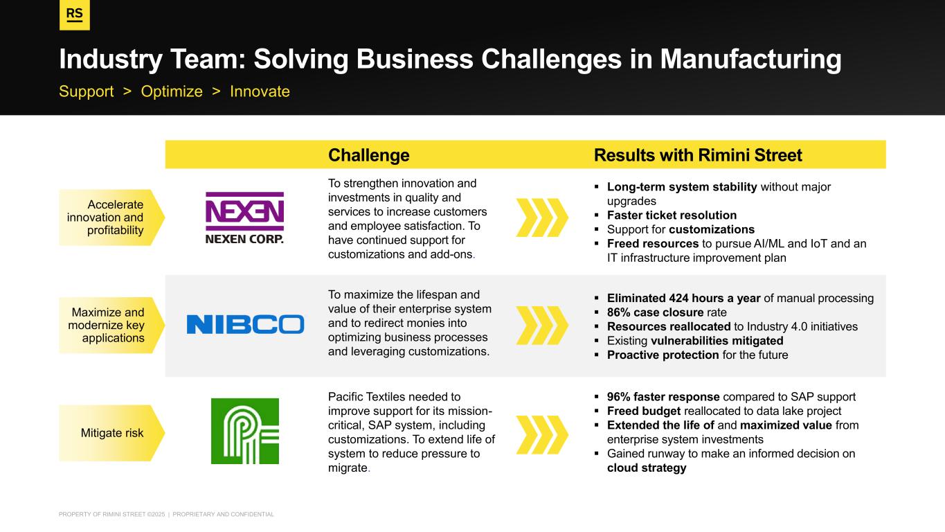 PROPERTY OF RIMINI STREET ©2025 | PROPRIETARY AND CONFIDENTIAL Support > Optimize > Innovate Industry Team: Solving Business Challenges in Manufacturing Challenge Results with Rimini Street To strengthen innovation and investments in quality and services to increase customers and employee satisfaction. To have continued support for customizations and add-ons. ▪ Long-term system stability without major upgrades ▪ Faster ticket resolution ▪ Support for customizations ▪ Freed resources to pursue AI/ML and IoT and an IT infrastructure improvement plan To maximize the lifespan and value of their enterprise system and to redirect monies into optimizing business processes and leveraging customizations. ▪ Eliminated 424 hours a year of manual processing ▪ 86% case closure rate ▪ Resources reallocated to Industry 4.0 initiatives ▪ Existing vulnerabilities mitigated ▪ Proactive protection for the future Pacific Textiles needed to improve support for its mission- critical, SAP system, including customizations. To extend life of system to reduce pressure to migrate. ▪ 96% faster response compared to SAP support ▪ Freed budget reallocated to data lake project ▪ Extended the life of and maximized value from enterprise system investments ▪ Gained runway to make an informed decision on cloud strategy Mitigate risk Accelerate innovation and profitability Maximize and modernize key applications