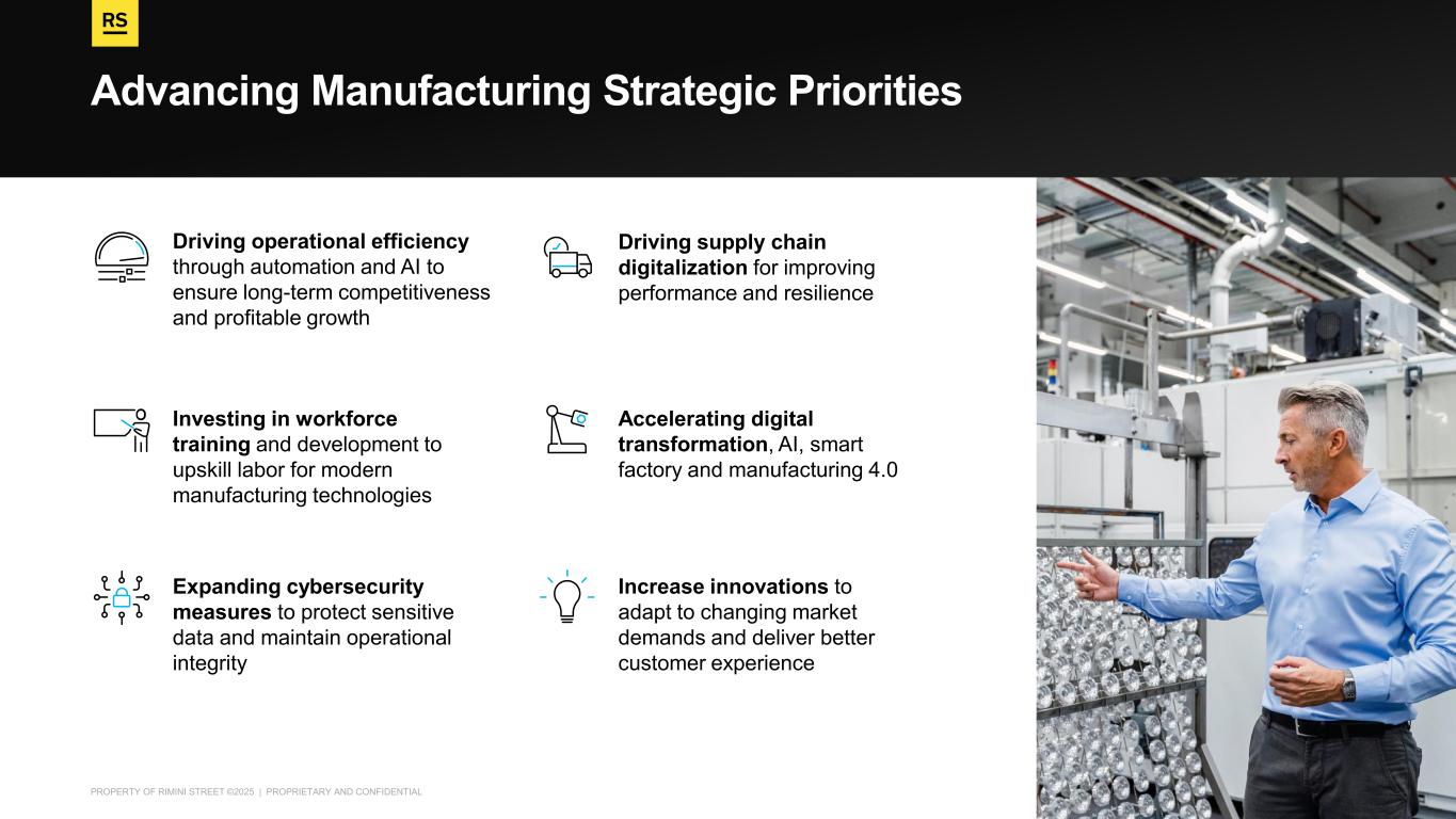 PROPERTY OF RIMINI STREET ©2025 | PROPRIETARY AND CONFIDENTIAL Advancing Manufacturing Strategic Priorities Driving operational efficiency through automation and AI to ensure long-term competitiveness and profitable growth Driving supply chain digitalization for improving performance and resilience Accelerating digital transformation, AI, smart factory and manufacturing 4.0 Investing in workforce training and development to upskill labor for modern manufacturing technologies Expanding cybersecurity measures to protect sensitive data and maintain operational integrity Increase innovations to adapt to changing market demands and deliver better customer experience