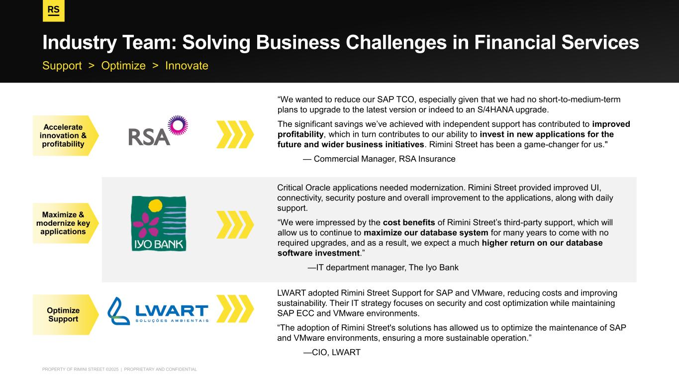 PROPERTY OF RIMINI STREET ©2025 | PROPRIETARY AND CONFIDENTIAL Support > Optimize > Innovate Industry Team: Solving Business Challenges in Financial Services “We wanted to reduce our SAP TCO, especially given that we had no short-to-medium-term plans to upgrade to the latest version or indeed to an S/4HANA upgrade. The significant savings we’ve achieved with independent support has contributed to improved profitability, which in turn contributes to our ability to invest in new applications for the future and wider business initiatives. Rimini Street has been a game-changer for us." — Commercial Manager, RSA Insurance Critical Oracle applications needed modernization. Rimini Street provided improved UI, connectivity, security posture and overall improvement to the applications, along with daily support. ​ “We were impressed by the cost benefits of Rimini Street’s third-party support, which will allow us to continue to maximize our database system for many years to come with no required upgrades, and as a result, we expect a much higher return on our database software investment.” —IT department manager, The Iyo Bank LWART adopted Rimini Street Support for SAP and VMware, reducing costs and improving sustainability. Their IT strategy focuses on security and cost optimization while maintaining SAP ECC and VMware environments. “The adoption of Rimini Street's solutions has allowed us to optimize the maintenance of SAP and VMware environments, ensuring a more sustainable operation.” —CIO, LWART Optimize Support Accelerate innovation & profitability Maximize & modernize key applications