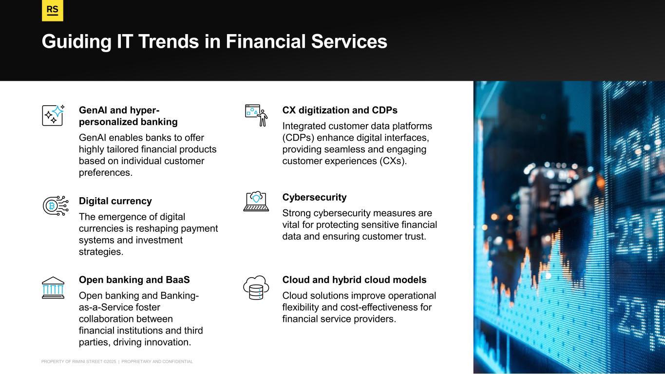 PROPERTY OF RIMINI STREET ©2025 | PROPRIETARY AND CONFIDENTIAL Guiding IT Trends in Financial Services GenAI and hyper- personalized banking GenAI enables banks to offer highly tailored financial products based on individual customer preferences. CX digitization and CDPs Integrated customer data platforms (CDPs) enhance digital interfaces, providing seamless and engaging customer experiences (CXs). Cybersecurity Strong cybersecurity measures are vital for protecting sensitive financial data and ensuring customer trust. Digital currency The emergence of digital currencies is reshaping payment systems and investment strategies. Open banking and BaaS Open banking and Banking- as-a-Service foster collaboration between financial institutions and third parties, driving innovation. Cloud and hybrid cloud models Cloud solutions improve operational flexibility and cost-effectiveness for financial service providers.