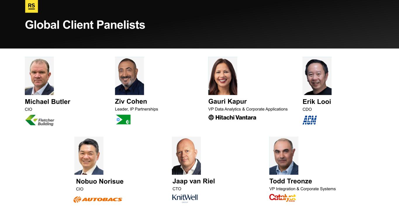Global Client Panelists Todd Treonze VP Integration & Corporate Systems Ziv Cohen Leader, IP Partnerships Jaap van Riel CTO Gauri Kapur VP Data Analytics & Corporate Applications Michael Butler CIO Nobuo Norisue CIO Erik Looi CDO