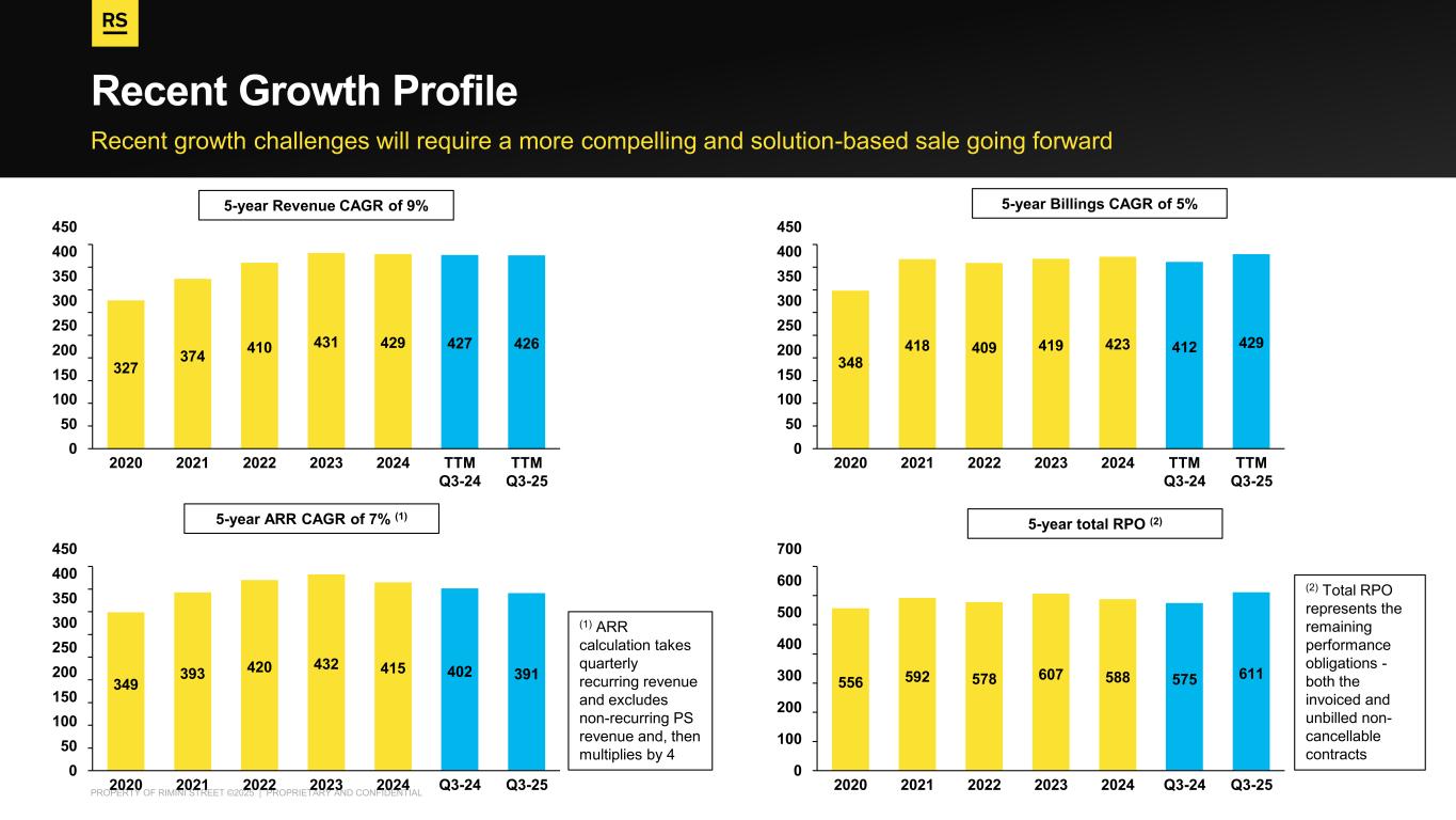 PROPERTY OF RIMINI STREET ©2025 | PROPRIETARY AND CONFIDENTIAL Recent growth challenges will require a more compelling and solution-based sale going forward Recent Growth Profile 0 50 100 150 200 250 300 350 400 450 327 2020 374 2021 410 2022 431 2023 429 2024 427 TTM Q3-24 426 TTM Q3-25 0 50 100 150 200 250 300 350 400 450 348 2020 418 2021 409 2022 419 2023 423 2024 412 TTM Q3-24 429 TTM Q3-25 0 50 100 150 200 250 300 350 400 450 349 2020 393 2021 420 2022 432 2023 415 2024 402 Q3-24 391 Q3-25 0 100 200 300 400 500 600 700 556 2020 592 2021 578 2022 607 2023 588 2024 575 Q3-24 611 Q3-25 5-year Revenue CAGR of 9% 5-year Billings CAGR of 5% 5-year ARR CAGR of 7% (1) (1) ARR calculation takes quarterly recurring revenue and excludes non-recurring PS revenue and, then multiplies by 4 5-year total RPO (2) (2) Total RPO represents the remaining performance obligations - both the invoiced and unbilled non- cancellable contracts