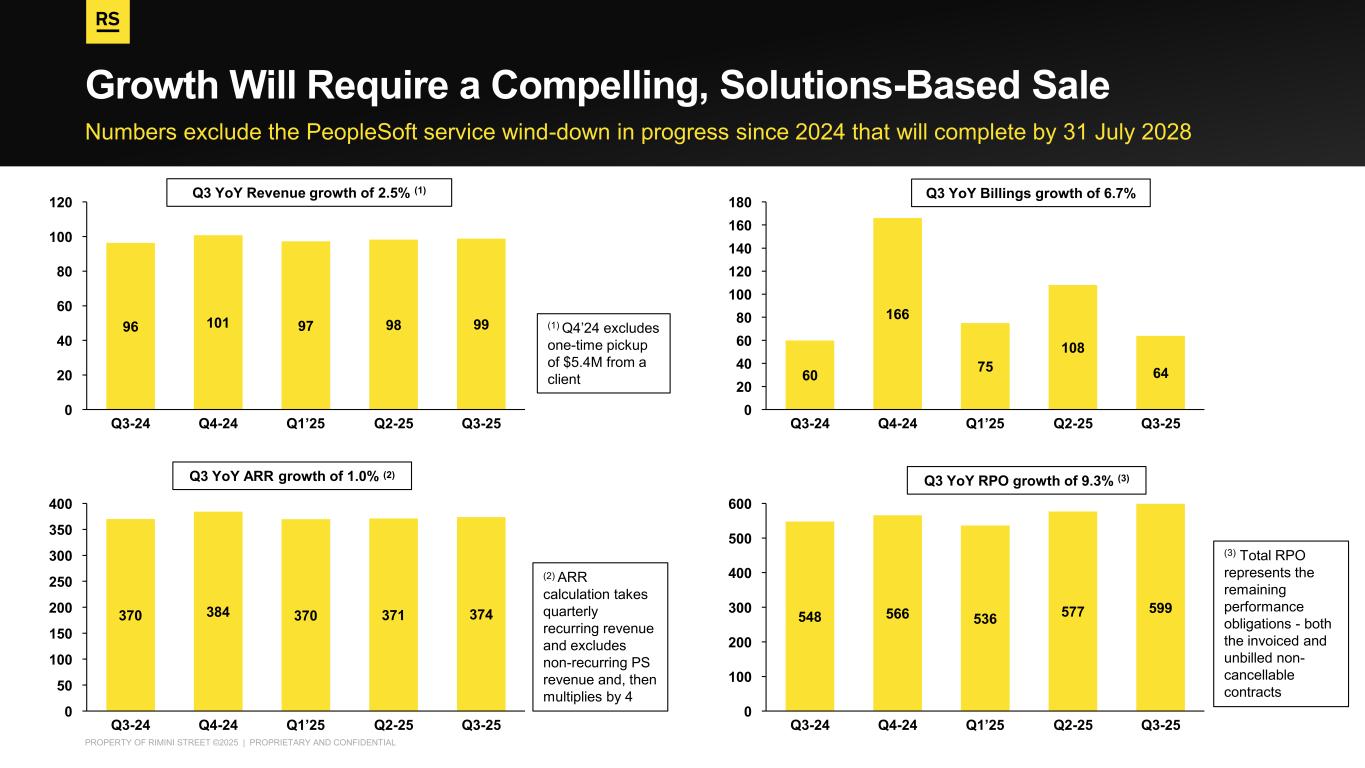 PROPERTY OF RIMINI STREET ©2025 | PROPRIETARY AND CONFIDENTIAL Numbers exclude the PeopleSoft service wind-down in progress since 2024 that will complete by 31 July 2028 Growth Will Require a Compelling, Solutions-Based Sale 0 20 40 60 80 100 120 96 Q3-24 101 Q4-24 97 Q1’25 98 Q2-25 99 Q3-25 Q3 YoY Revenue growth of 2.5% (1) Q3 YoY Billings growth of 6.7% Q3 YoY ARR growth of 1.0% (2) (2) ARR calculation takes quarterly recurring revenue and excludes non-recurring PS revenue and, then multiplies by 4 Q3 YoY RPO growth of 9.3% (3) (3) Total RPO represents the remaining performance obligations - both the invoiced and unbilled non- cancellable contracts 0 20 40 60 80 100 120 140 160 180 60 Q3-24 166 Q4-24 75 Q1’25 108 Q2-25 64 Q3-25 0 50 100 150 200 250 300 350 400 370 Q3-24 384 Q4-24 370 Q1’25 371 Q2-25 374 Q3-25 0 100 200 300 400 500 600 548 Q3-24 566 Q4-24 536 Q1’25 577 Q2-25 599 Q3-25 (1) Q4’24 excludes one-time pickup of $5.4M from a client
