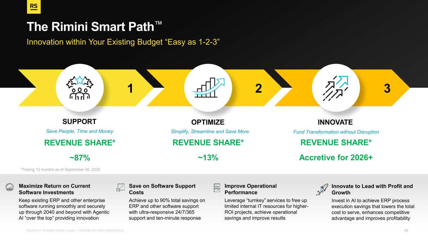 PROPERTY OF RIMINI STREET ©2025 | PROPRIETARY AND CONFIDENTIAL Innovation within Your Existing Budget “Easy as 1-2-3” The Rimini Smart Path REVENUE SHARE* ~87% REVENUE SHARE* ~13% REVENUE SHARE* Accretive for 2026+ SUPPORT OPTIMIZE INNOVATE Save People, Time and Money Simplify, Streamline and Save More Fund Transformation without Disruption 1 32 Maximize Return on Current Software Investments Keep existing ERP and other enterprise software running smoothly and securely up through 2040 and beyond with Agentic AI “over the top” providing innovation Save on Software Support Costs Achieve up to 90% total savings on ERP and other software support with ultra-responsive 24/7/365 support and ten-minute response Improve Operational Performance Leverage “turnkey” services to free up limited internal IT resources for higher- ROI projects, achieve operational savings and improve results Innovate to Lead with Profit and Growth Invest in AI to achieve ERP process execution savings that lowers the total cost to serve, enhances competitive advantage and improves profitability 93 *Trailing 12 months as of September 30, 2025