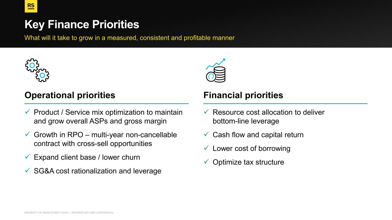 PROPERTY OF RIMINI STREET ©2025 | PROPRIETARY AND CONFIDENTIAL What will it take to grow in a measured, consistent and profitable manner Key Finance Priorities Operational priorities ✓ Product / Service mix optimization to maintain and grow overall ASPs and gross margin ✓ Growth in RPO – multi-year non-cancellable contract with cross-sell opportunities ✓ Expand client base / lower churn ✓ SG&A cost rationalization and leverage Financial priorities ✓ Resource cost allocation to deliver bottom-line leverage ✓ Cash flow and capital return ✓ Lower cost of borrowing ✓ Optimize tax structure