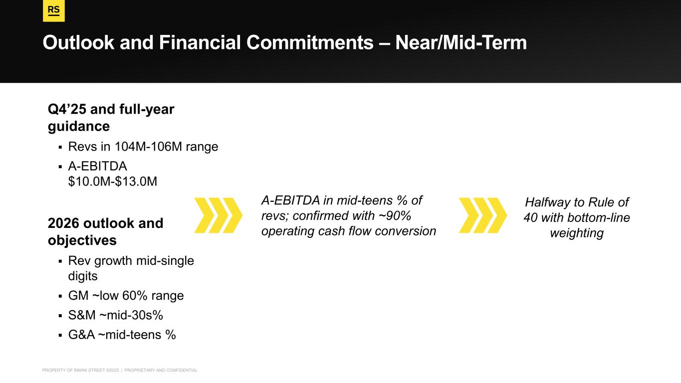 PROPERTY OF RIMINI STREET ©2025 | PROPRIETARY AND CONFIDENTIAL Outlook and Financial Commitments – Near/Mid-Term Q4’25 and full-year guidance ▪ Revs in 104M-106M range ▪ A-EBITDA $10.0M-$13.0M 2026 outlook and objectives ▪ Rev growth mid-single digits ▪ GM ~low 60% range ▪ S&M ~mid-30s% ▪ G&A ~mid-teens % A-EBITDA in mid-teens % of revs; confirmed with ~90% operating cash flow conversion Halfway to Rule of 40 with bottom-line weighting
