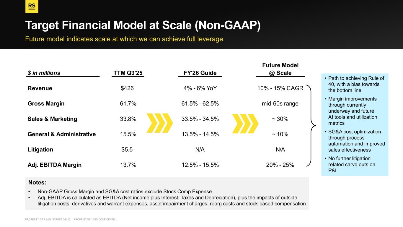 PROPERTY OF RIMINI STREET ©2025 | PROPRIETARY AND CONFIDENTIAL Future Model $ in millions TTM Q3'25 FY'26 Guide @ Scale Revenue $426 4% - 6% YoY 10% - 15% CAGR Gross Margin 61.7% 61.5% - 62.5% mid-60s range Sales & Marketing 33.8% 33.5% - 34.5% ~ 30% General & Administrative 15.5% 13.5% - 14.5% ~ 10% Litigation $5.5 N/A N/A Adj. EBITDA Margin 13.7% 12.5% - 15.5% 20% - 25% Future model indicates scale at which we can achieve full leverage Target Financial Model at Scale (Non-GAAP) Notes: • Non-GAAP Gross Margin and SG&A cost ratios exclude Stock Comp Expense • Adj. EBITDA is calculated as EBITDA (Net income plus Interest, Taxes and Depreciation), plus the impacts of outside litigation costs, derivatives and warrant expenses, asset impairment charges, reorg costs and stock-based compensation • Path to achieving Rule of 40, with a bias towards the bottom line • Margin improvements through currently underway and future AI tools and utilization metrics • SG&A cost optimization through process automation and improved sales effectiveness • No further litigation related carve outs on P&L