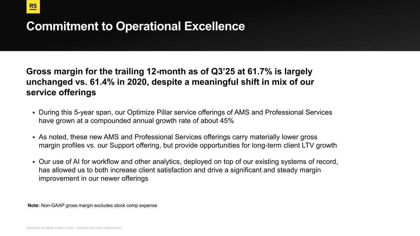 PROPERTY OF RIMINI STREET ©2025 | PROPRIETARY AND CONFIDENTIAL Commitment to Operational Excellence Gross margin for the trailing 12-month as of Q3’25 at 61.7% is largely unchanged vs. 61.4% in 2020, despite a meaningful shift in mix of our service offerings ▪ During this 5-year span, our Optimize Pillar service offerings of AMS and Professional Services have grown at a compounded annual growth rate of about 45% ▪ As noted, these new AMS and Professional Services offerings carry materially lower gross margin profiles vs. our Support offering, but provide opportunities for long-term client LTV growth ▪ Our use of AI for workflow and other analytics, deployed on top of our existing systems of record, has allowed us to both increase client satisfaction and drive a significant and steady margin improvement in our newer offerings Note: Non-GAAP gross margin excludes stock comp expense