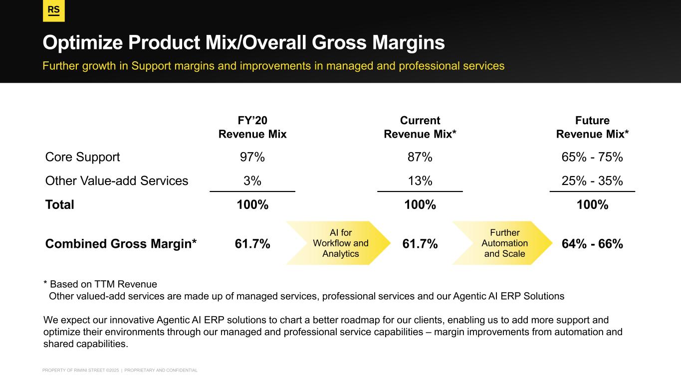 PROPERTY OF RIMINI STREET ©2025 | PROPRIETARY AND CONFIDENTIAL Further growth in Support margins and improvements in managed and professional services Optimize Product Mix/Overall Gross Margins Further Automation and Scale * Based on TTM Revenue Other valued-add services are made up of managed services, professional services and our Agentic AI ERP Solutions We expect our innovative Agentic AI ERP solutions to chart a better roadmap for our clients, enabling us to add more support and optimize their environments through our managed and professional service capabilities – margin improvements from automation and shared capabilities. AI for Workflow and Analytics Core Support Other Value-add Services Total Combined Gross Margin* FY’20 Revenue Mix 97% 3% 100% 61.7% Current Revenue Mix* 87% 13% 100% 61.7% Future Revenue Mix* 65% - 75% 25% - 35% 100% 64% - 66%
