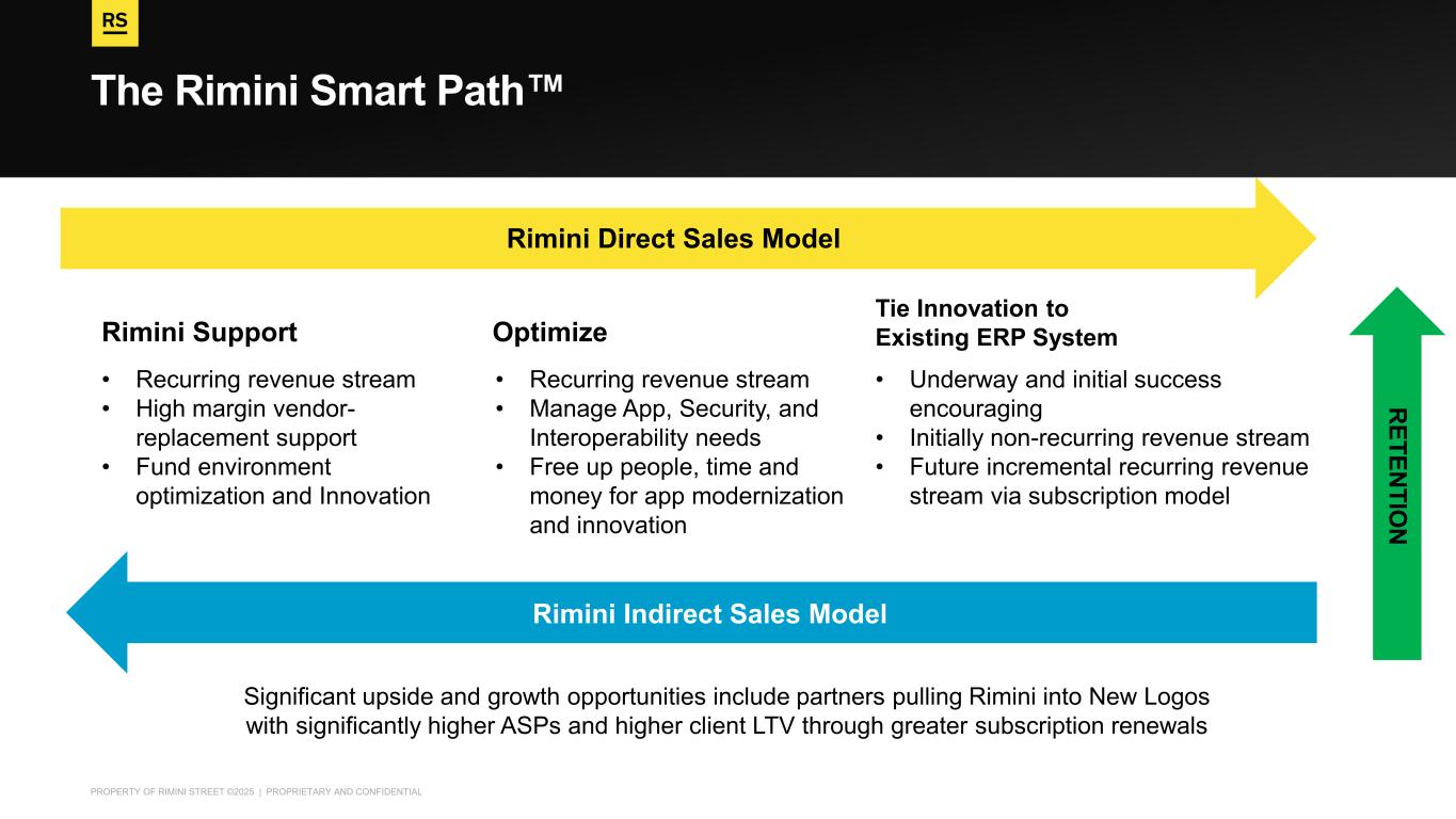 PROPERTY OF RIMINI STREET ©2025 | PROPRIETARY AND CONFIDENTIAL The Rimini Smart Path Rimini Support Optimize Tie Innovation to Existing ERP System • Recurring revenue stream • High margin vendor- replacement support • Fund environment optimization and Innovation • Recurring revenue stream • Manage App, Security, and Interoperability needs • Free up people, time and money for app modernization and innovation • Underway and initial success encouraging • Initially non-recurring revenue stream • Future incremental recurring revenue stream via subscription model Rimini Direct Sales Model Rimini Indirect Sales Model R E T E N T IO N Significant upside and growth opportunities include partners pulling Rimini into New Logos with significantly higher ASPs and higher client LTV through greater subscription renewals