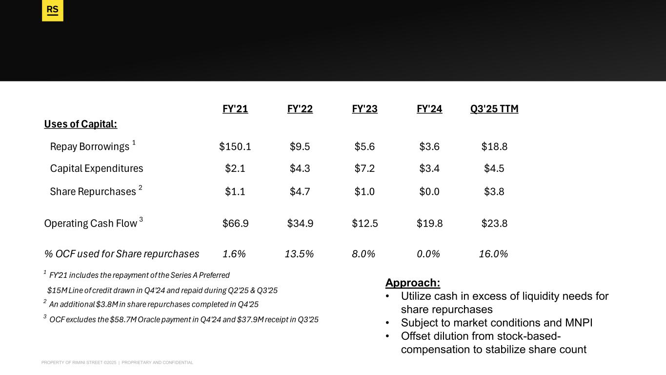 PROPERTY OF RIMINI STREET ©2025 | PROPRIETARY AND CONFIDENTIAL FY'21 FY'22 FY'23 FY'24 Q3'25 TTM Uses of Capital: Repay Borrowings 1 $150.1 $9.5 $5.6 $3.6 $18.8 Capital Expenditures $2.1 $4.3 $7.2 $3.4 $4.5 Share Repurchases 2 $1.1 $4.7 $1.0 $0.0 $3.8 Operating Cash Flow 3 $66.9 $34.9 $12.5 $19.8 $23.8 % OCF used for Share repurchases 1.6% 13.5% 8.0% 0.0% 16.0% 1 FY'21 includes the repayment of the Series A Preferred $15M Line of credit drawn in Q4'24 and repaid during Q2'25 & Q3'25 2 An additional $3.8M in share repurchases completed in Q4'25 3 OCF excludes the $58.7M Oracle payment in Q4'24 and $37.9M receipt in Q3'25 Approach: • Utilize cash in excess of liquidity needs for share repurchases • Subject to market conditions and MNPI • Offset dilution from stock-based- compensation to stabilize share count