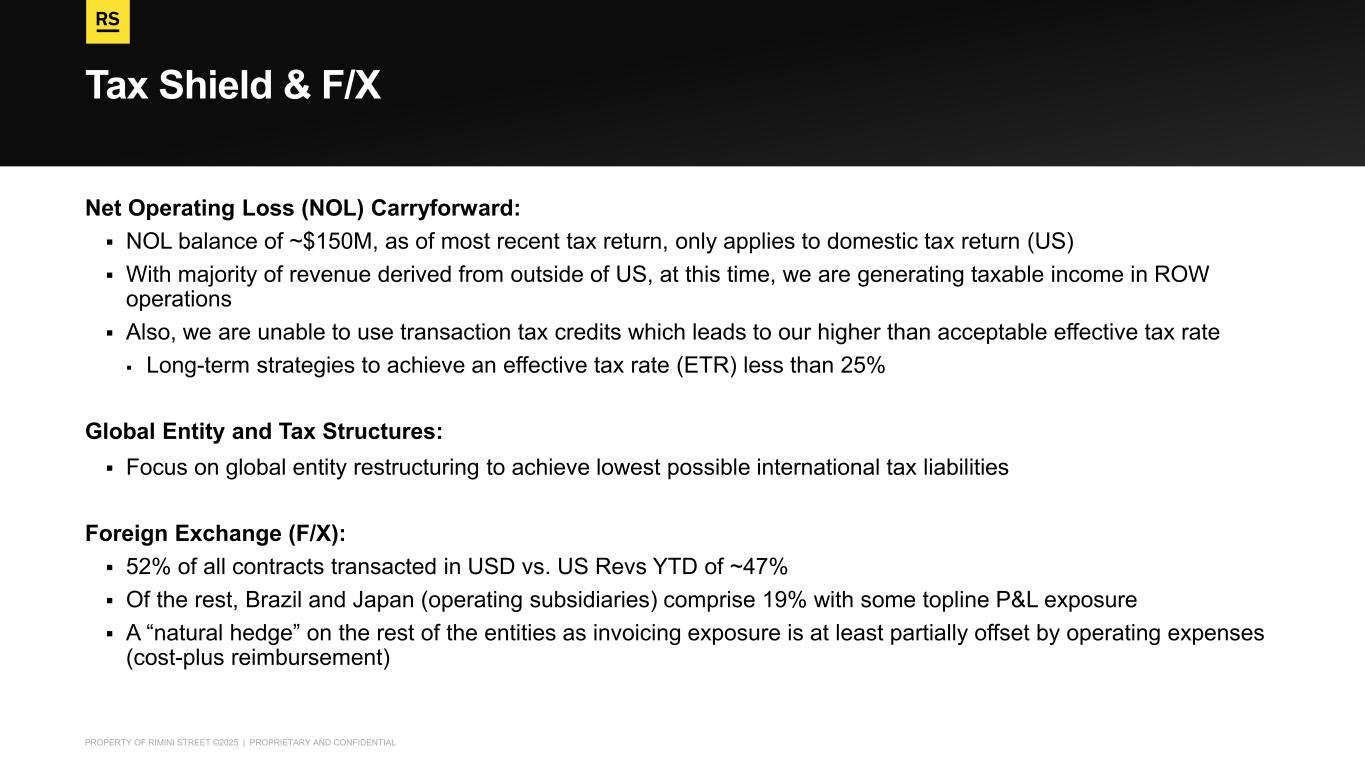 PROPERTY OF RIMINI STREET ©2025 | PROPRIETARY AND CONFIDENTIAL Tax Shield & F/X Net Operating Loss (NOL) Carryforward: ▪ NOL balance of ~$150M, as of most recent tax return, only applies to domestic tax return (US) ▪ With majority of revenue derived from outside of US, at this time, we are generating taxable income in ROW operations ▪ Also, we are unable to use transaction tax credits which leads to our higher than acceptable effective tax rate ▪ Long-term strategies to achieve an effective tax rate (ETR) less than 25% Global Entity and Tax Structures: ▪ Focus on global entity restructuring to achieve lowest possible international tax liabilities Foreign Exchange (F/X): ▪ 52% of all contracts transacted in USD vs. US Revs YTD of ~47% ▪ Of the rest, Brazil and Japan (operating subsidiaries) comprise 19% with some topline P&L exposure ▪ A “natural hedge” on the rest of the entities as invoicing exposure is at least partially offset by operating expenses (cost-plus reimbursement)