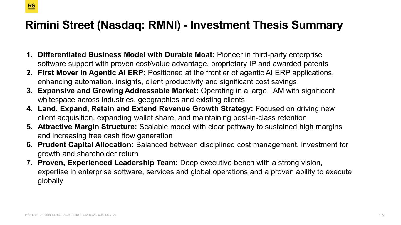 Rimini Street (Nasdaq: RMNI) - Investment Thesis Summary 105 1. Differentiated Business Model with Durable Moat: Pioneer in third-party enterprise software support with proven cost/value advantage, proprietary IP and awarded patents 2. First Mover in Agentic AI ERP: Positioned at the frontier of agentic AI ERP applications, enhancing automation, insights, client productivity and significant cost savings 3. Expansive and Growing Addressable Market: Operating in a large TAM with significant whitespace across industries, geographies and existing clients 4. Land, Expand, Retain and Extend Revenue Growth Strategy: Focused on driving new client acquisition, expanding wallet share, and maintaining best-in-class retention 5. Attractive Margin Structure: Scalable model with clear pathway to sustained high margins and increasing free cash flow generation 6. Prudent Capital Allocation: Balanced between disciplined cost management, investment for growth and shareholder return 7. Proven, Experienced Leadership Team: Deep executive bench with a strong vision, expertise in enterprise software, services and global operations and a proven ability to execute globally
