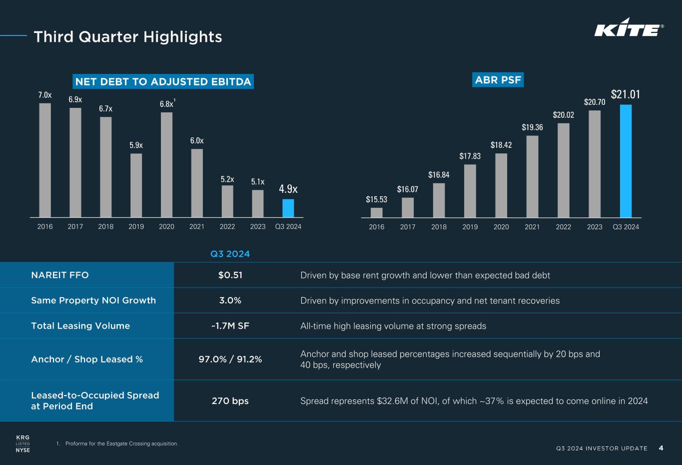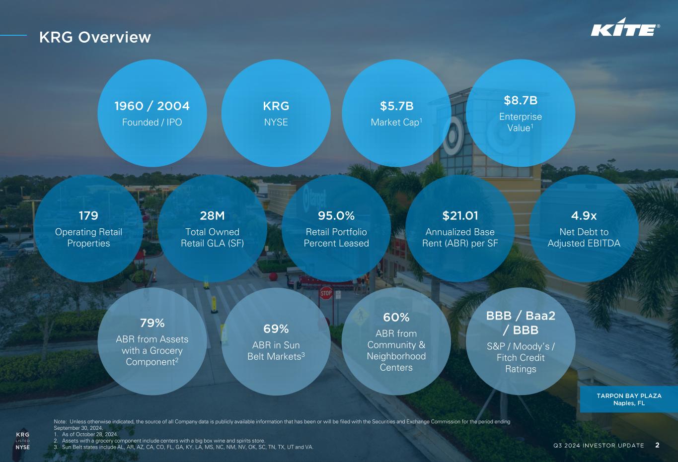 Note: Unless otherwise indicated, the source of all Company data is publicly available information that has been or will be filed with the Securities and Exchange Commission for the period ending September 30, 2024. 1. As of October 28, 2024. 2. Assets with a grocery component include centers with a big box wine and spirits store. 3. Sun Belt states include AL, AR, AZ, CA, CO, FL, GA, KY, LA, MS, NC, NM, NV, OK, SC, TN, TX, UT and VA. Founded / IPO NYSE Market Cap1 Enterprise Value1 Operating Retail Properties Total Owned Retail GLA (SF) Retail Portfolio Percent Leased Annualized Base Rent (ABR) per SF Net Debt to Adjusted EBITDA ABR from Assets with a Grocery Component2 ABR in Sun Belt Markets3 ABR from Community & Neighborhood Centers S&P / Moody’s / Fitch Credit Ratings
