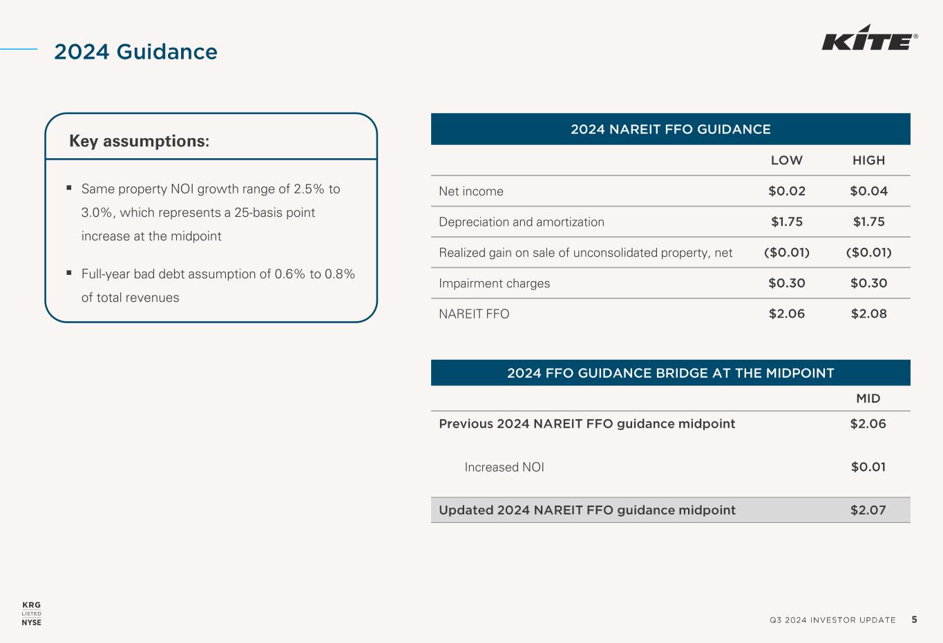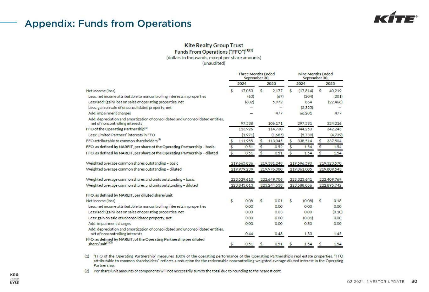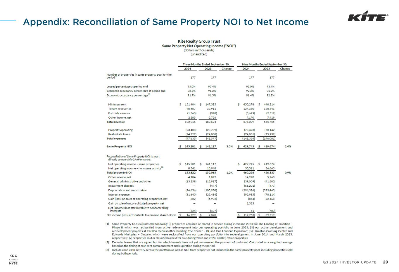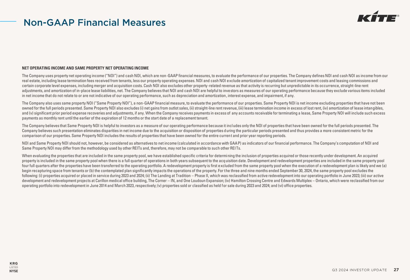 NET OPERATING INCOME AND SAME PROPERTY NET OPERATING INCOME The Company uses property net operating income (“NOI”) and cash NOI, which are non-GAAP financial measures, to evaluate the performance of our properties. The Company defines NOI and cash NOI as income from our real estate, including lease termination fees received from tenants, less our property operating expenses. NOI and cash NOI exclude amortization of capitalized tenant improvement costs and leasing commissions and certain corporate level expenses, including merger and acquisition costs. Cash NOI also excludes other property-related revenue as that activity is recurring but unpredictable in its occurrence, straight-line rent adjustments, and amortization of in-place lease liabilities, net. The Company believes that NOI and cash NOI are helpful to investors as measures of our operating performance because they exclude various items included in net income that do not relate to or are not indicative of our operating performance, such as depreciation and amortization, interest expense, and impairment, if any. The Company also uses same property NOI (“Same Property NOI”), a non-GAAP financial measure, to evaluate the performance of our properties. Same Property NOI is net income excluding properties that have not been owned for the full periods presented. Same Property NOI also excludes (i) net gains from outlot sales, (ii) straight-line rent revenue, (iii) lease termination income in excess of lost rent, (iv) amortization of lease intangibles, and (v) significant prior period expense recoveries and adjustments, if any. When the Company receives payments in excess of any accounts receivable for terminating a lease, Same Property NOI will include such excess payments as monthly rent until the earlier of the expiration of 12 months or the start date of a replacement tenant. The Company believes that Same Property NOI is helpful to investors as a measure of our operating performance because it includes only the NOI of properties that have been owned for the full periods presented. The Company believes such presentation eliminates disparities in net income due to the acquisition or disposition of properties during the particular periods presented and thus provides a more consistent metric for the comparison of our properties. Same Property NOI includes the results of properties that have been owned for the entire current and prior year reporting periods. NOI and Same Property NOI should not, however, be considered as alternatives to net income (calculated in accordance with GAAP) as indicators of our financial performance. The Company’s computation of NOI and Same Property NOI may differ from the methodology used by other REITs and, therefore, may not be comparable to such other REITs. When evaluating the properties that are included in the same property pool, we have established specific criteria for determining the inclusion of properties acquired or those recently under development. An acquired property is included in the same property pool when there is a full quarter of operations in both years subsequent to the acquisition date. Development and redevelopment properties are included in the same property pool four full quarters after the properties have been transferred to the operating portfolio. A redevelopment property is first excluded from the same property pool when the execution of a redevelopment plan is likely and we (a) begin recapturing space from tenants or (b) the contemplated plan significantly impacts the operations of the property. For the three and nine months ended September 30, 2024, the same property pool excludes the following: (i) properties acquired or placed in service during 2023 and 2024; (ii) The Landing at Tradition – Phase II, which was reclassified from active redevelopment into our operating portfolio in June 2023; (iii) our active development and redevelopment projects at Carillon medical office building, The Corner – IN, and One Loudoun Expansion; (iv) Hamilton Crossing Centre and Edwards Multiplex – Ontario, which were reclassified from our operating portfolio into redevelopment in June 2014 and March 2023, respectively; (v) properties sold or classified as held for sale during 2023 and 2024; and (vi) office properties.