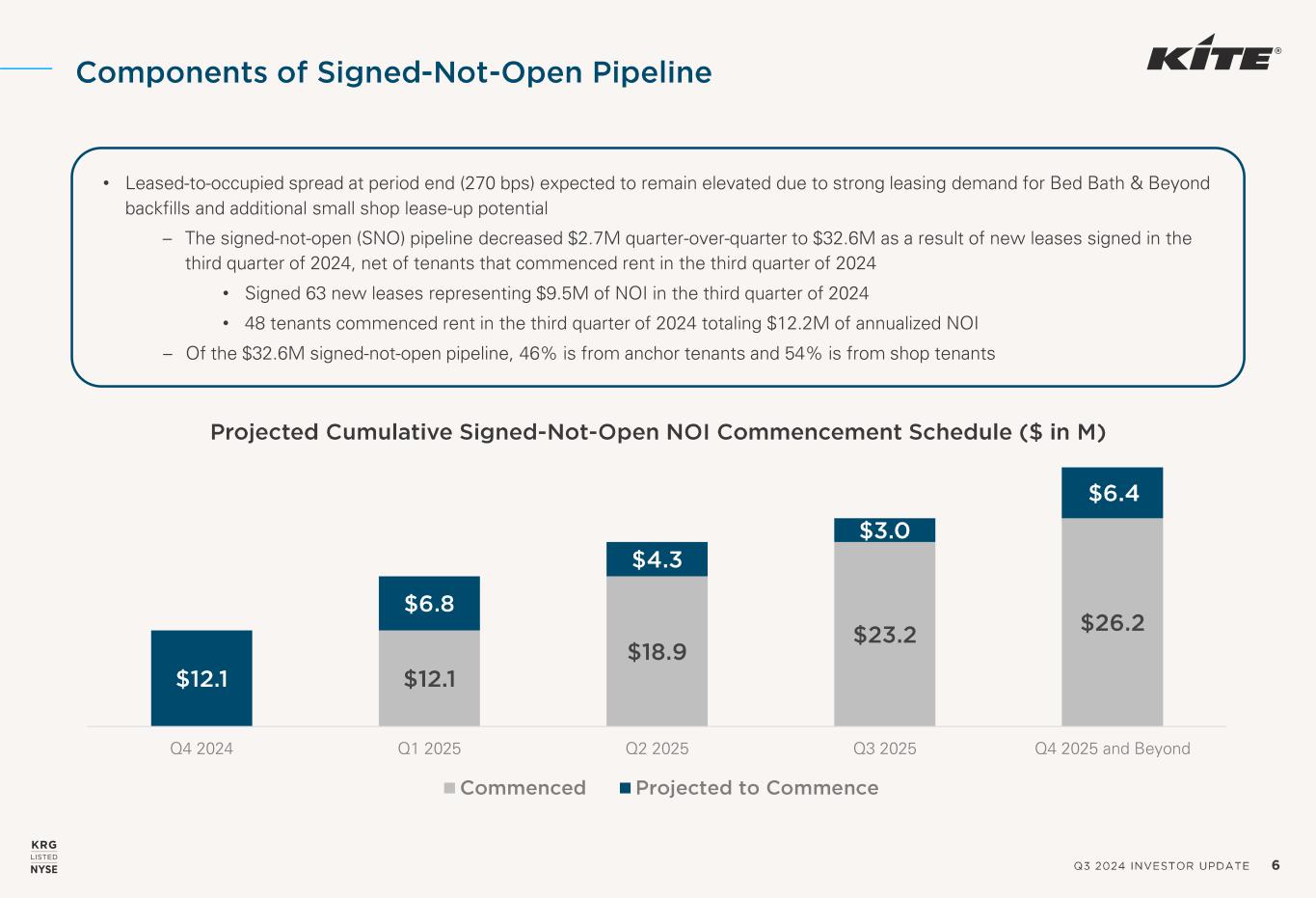 • Leased-to-occupied spread at period end (270 bps) expected to remain elevated due to strong leasing demand for Bed Bath & Beyond backfills and additional small shop lease-up potential – The signed-not-open (SNO) pipeline decreased $2.7M quarter-over-quarter to $32.6M as a result of new leases signed in the third quarter of 2024, net of tenants that commenced rent in the third quarter of 2024 • Signed 63 new leases representing $9.5M of NOI in the third quarter of 2024 • 48 tenants commenced rent in the third quarter of 2024 totaling $12.2M of annualized NOI – Of the $32.6M signed-not-open pipeline, 46% is from anchor tenants and 54% is from shop tenants Q4 2024 Q1 2025 Q2 2025 Q3 2025 Q4 2025 and Beyond