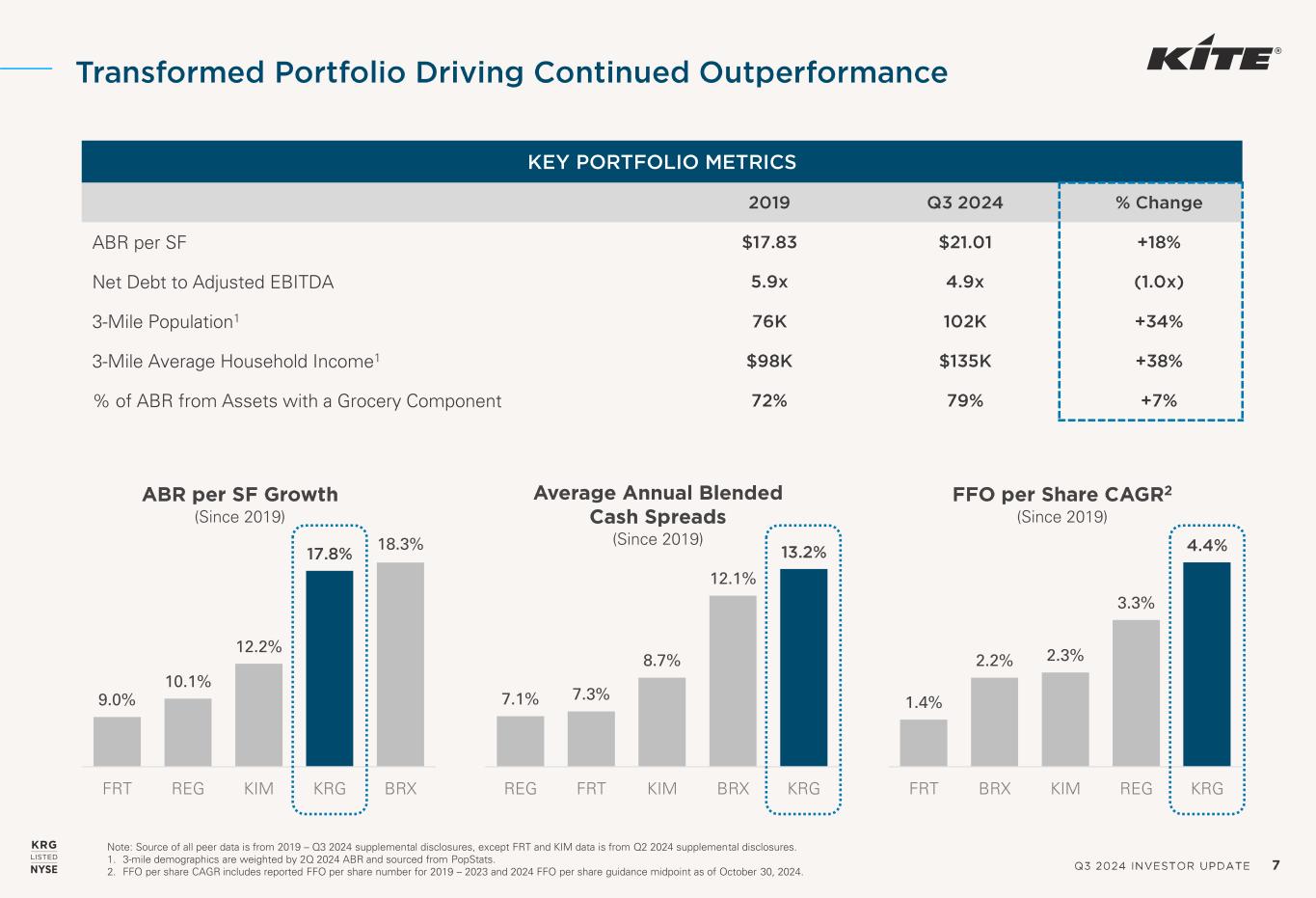 ABR per SF Net Debt to Adjusted EBITDA 3-Mile Population1 3-Mile Average Household Income1 % of ABR from Assets with a Grocery Component 9.0% 10.1% 12.2% 18.3% FRT REG KIM KRG BRX (Since 2019) 7.1% 7.3% 8.7% 12.1% REG FRT KIM BRX KRG (Since 2019) 1.4% 2.2% 2.3% 3.3% FRT BRX KIM REG KRG (Since 2019) Note: Source of all peer data is from 2019 – Q3 2024 supplemental disclosures, except FRT and KIM data is from Q2 2024 supplemental disclosures. 1. 3-mile demographics are weighted by 2Q 2024 ABR and sourced from PopStats. 2. FFO per share CAGR includes reported FFO per share number for 2019 – 2023 and 2024 FFO per share guidance midpoint as of October 30, 2024.