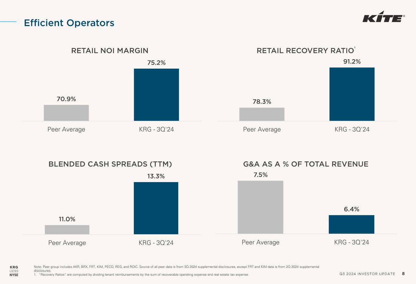 Peer Average KRG - 3Q'24 Note: Peer group includes AKR, BRX, FRT, KIM, PECO, REG, and ROIC. Source of all peer data is from 3Q 2024 supplemental disclosures, except FRT and KIM data is from 2Q 2024 supplemental disclosures. 1. “Recovery Ratios” are computed by dividing tenant reimbursements by the sum of recoverable operating expense and real estate tax expense. Peer Average KRG - 3Q'24 Peer Average KRG - 3Q'24 Peer Average KRG - 3Q'24