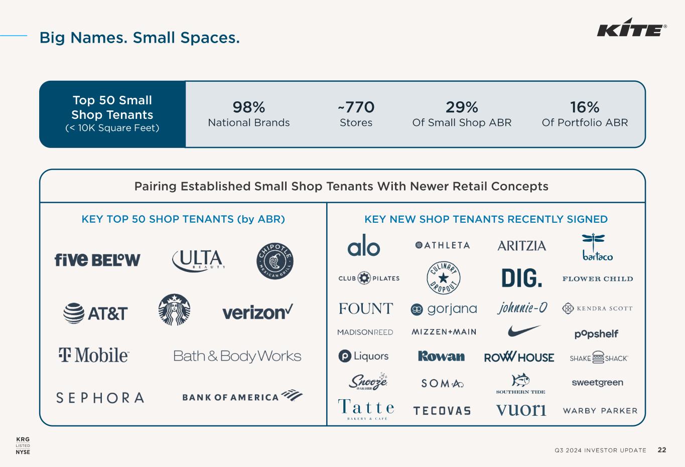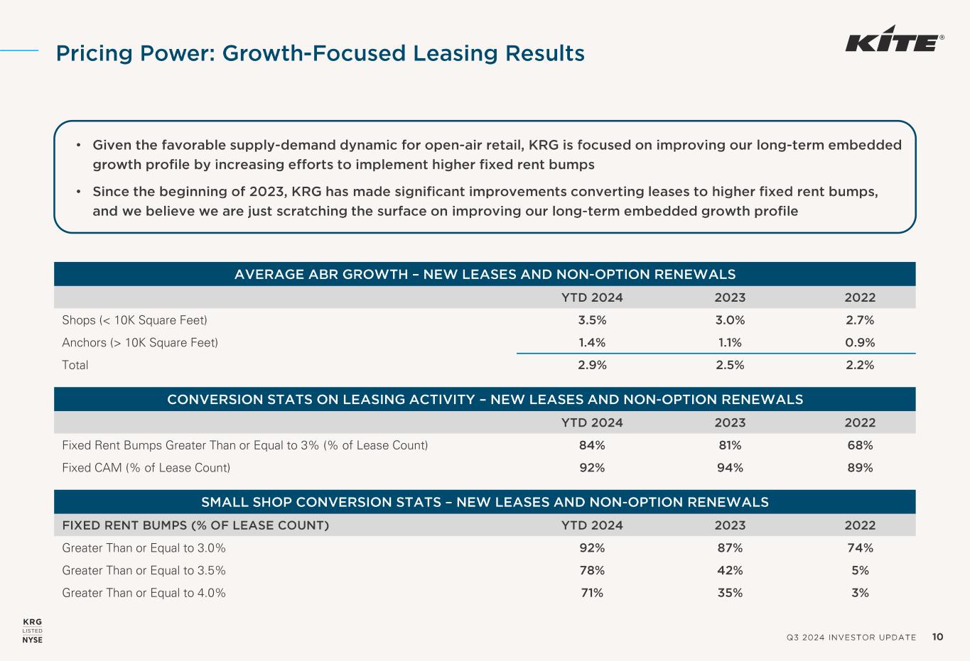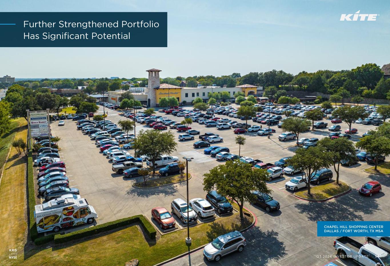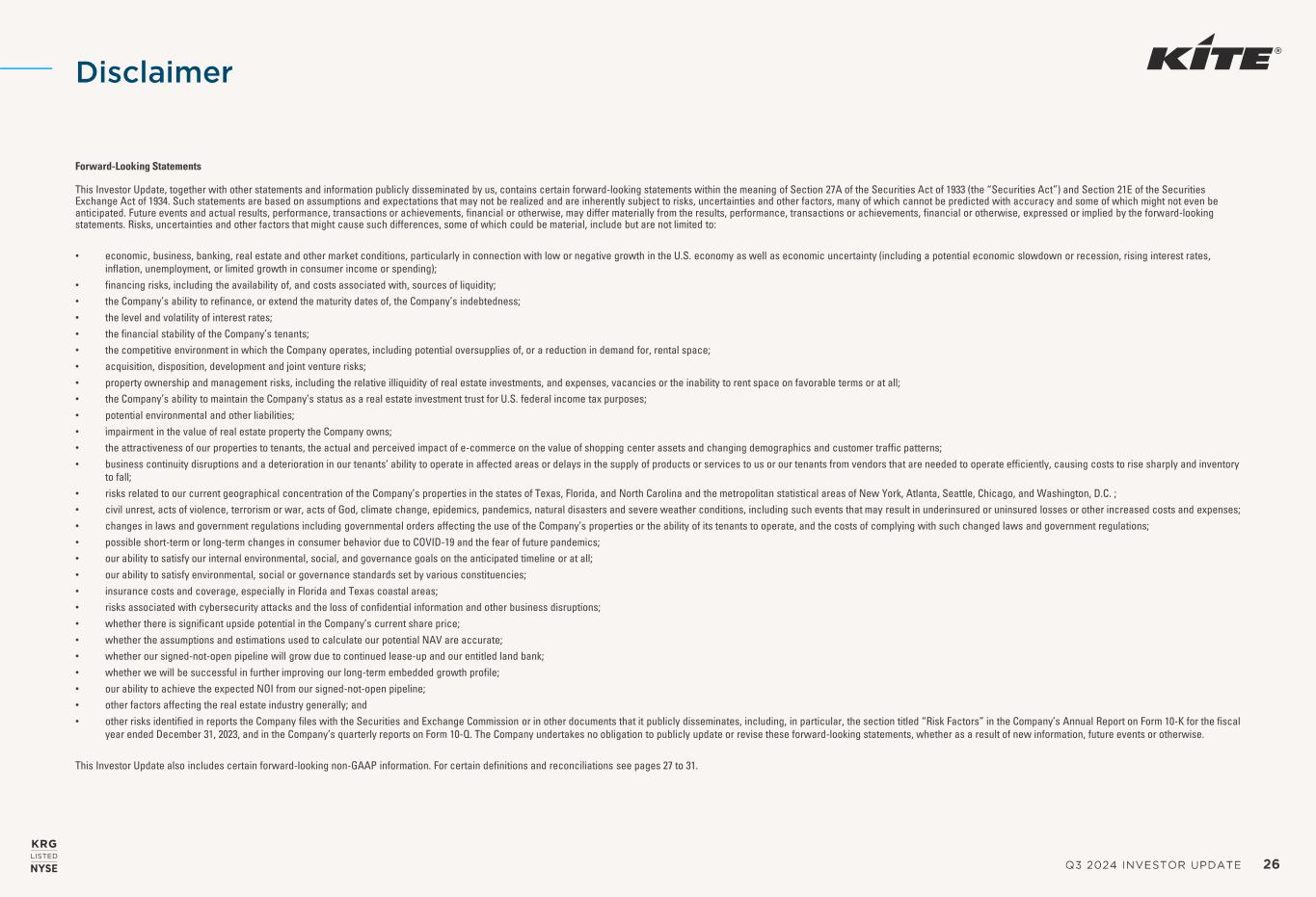 Forward-Looking Statements This Investor Update, together with other statements and information publicly disseminated by us, contains certain forward-looking statements within the meaning of Section 27A of the Securities Act of 1933 (the “Securities Act”) and Section 21E of the Securities Exchange Act of 1934. Such statements are based on assumptions and expectations that may not be realized and are inherently subject to risks, uncertainties and other factors, many of which cannot be predicted with accuracy and some of which might not even be anticipated. Future events and actual results, performance, transactions or achievements, financial or otherwise, may differ materially from the results, performance, transactions or achievements, financial or otherwise, expressed or implied by the forward-looking statements. Risks, uncertainties and other factors that might cause such differences, some of which could be material, include but are not limited to: • economic, business, banking, real estate and other market conditions, particularly in connection with low or negative growth in the U.S. economy as well as economic uncertainty (including a potential economic slowdown or recession, rising interest rates, inflation, unemployment, or limited growth in consumer income or spending); • financing risks, including the availability of, and costs associated with, sources of liquidity; • the Company’s ability to refinance, or extend the maturity dates of, the Company’s indebtedness; • the level and volatility of interest rates; • the financial stability of the Company’s tenants; • the competitive environment in which the Company operates, including potential oversupplies of, or a reduction in demand for, rental space; • acquisition, disposition, development and joint venture risks; • property ownership and management risks, including the relative illiquidity of real estate investments, and expenses, vacancies or the inability to rent space on favorable terms or at all; • the Company’s ability to maintain the Company’s status as a real estate investment trust for U.S. federal income tax purposes; • potential environmental and other liabilities; • impairment in the value of real estate property the Company owns; • the attractiveness of our properties to tenants, the actual and perceived impact of e-commerce on the value of shopping center assets and changing demographics and customer traffic patterns; • business continuity disruptions and a deterioration in our tenants’ ability to operate in affected areas or delays in the supply of products or services to us or our tenants from vendors that are needed to operate efficiently, causing costs to rise sharply and inventory to fall; • risks related to our current geographical concentration of the Company’s properties in the states of Texas, Florida, and North Carolina and the metropolitan statistical areas of New York, Atlanta, Seattle, Chicago, and Washington, D.C. ; • civil unrest, acts of violence, terrorism or war, acts of God, climate change, epidemics, pandemics, natural disasters and severe weather conditions, including such events that may result in underinsured or uninsured losses or other increased costs and expenses; • changes in laws and government regulations including governmental orders affecting the use of the Company’s properties or the ability of its tenants to operate, and the costs of complying with such changed laws and government regulations; • possible short-term or long-term changes in consumer behavior due to COVID-19 and the fear of future pandemics; • our ability to satisfy our internal environmental, social, and governance goals on the anticipated timeline or at all; • our ability to satisfy environmental, social or governance standards set by various constituencies; • insurance costs and coverage, especially in Florida and Texas coastal areas; • risks associated with cybersecurity attacks and the loss of confidential information and other business disruptions; • whether there is significant upside potential in the Company’s current share price; • whether the assumptions and estimations used to calculate our potential NAV are accurate; • whether our signed-not-open pipeline will grow due to continued lease-up and our entitled land bank; • whether we will be successful in further improving our long-term embedded growth profile; • our ability to achieve the expected NOI from our signed-not-open pipeline; • other factors affecting the real estate industry generally; and • other risks identified in reports the Company files with the Securities and Exchange Commission or in other documents that it publicly disseminates, including, in particular, the section titled “Risk Factors” in the Company’s Annual Report on Form 10-K for the fiscal year ended December 31, 2023, and in the Company’s quarterly reports on Form 10-Q. The Company undertakes no obligation to publicly update or revise these forward-looking statements, whether as a result of new information, future events or otherwise. This Investor Update also includes certain forward-looking non-GAAP information. For certain definitions and reconciliations see pages 27 to 31.