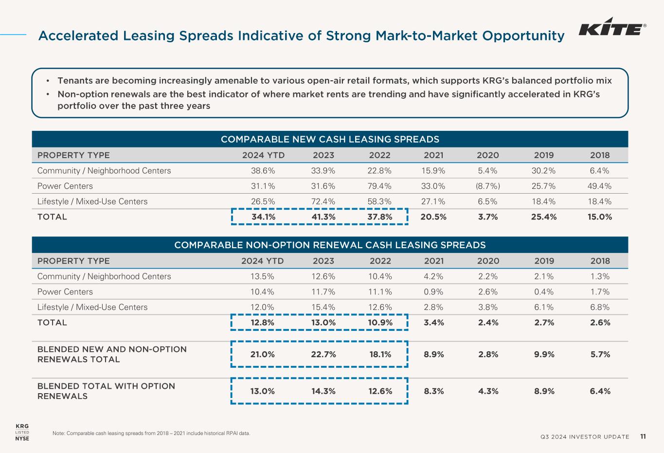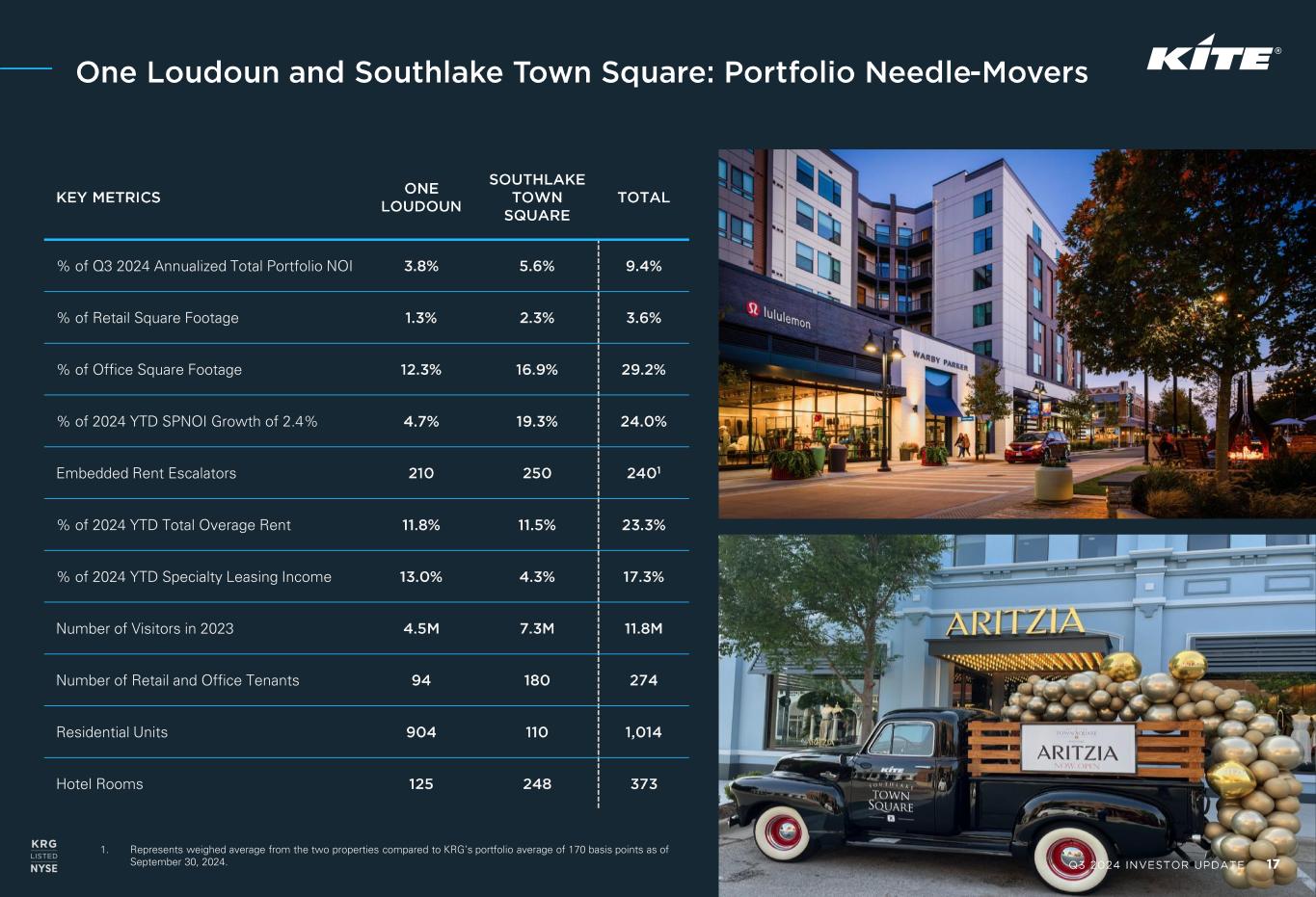 % of Q3 2024 Annualized Total Portfolio NOI % of Retail Square Footage % of Office Square Footage % of 2024 YTD SPNOI Growth of 2.4% Embedded Rent Escalators % of 2024 YTD Total Overage Rent % of 2024 YTD Specialty Leasing Income Number of Visitors in 2023 Number of Retail and Office Tenants Residential Units Hotel Rooms 1. Represents weighed average from the two properties compared to KRG’s portfolio average of 170 basis points as of September 30, 2024.