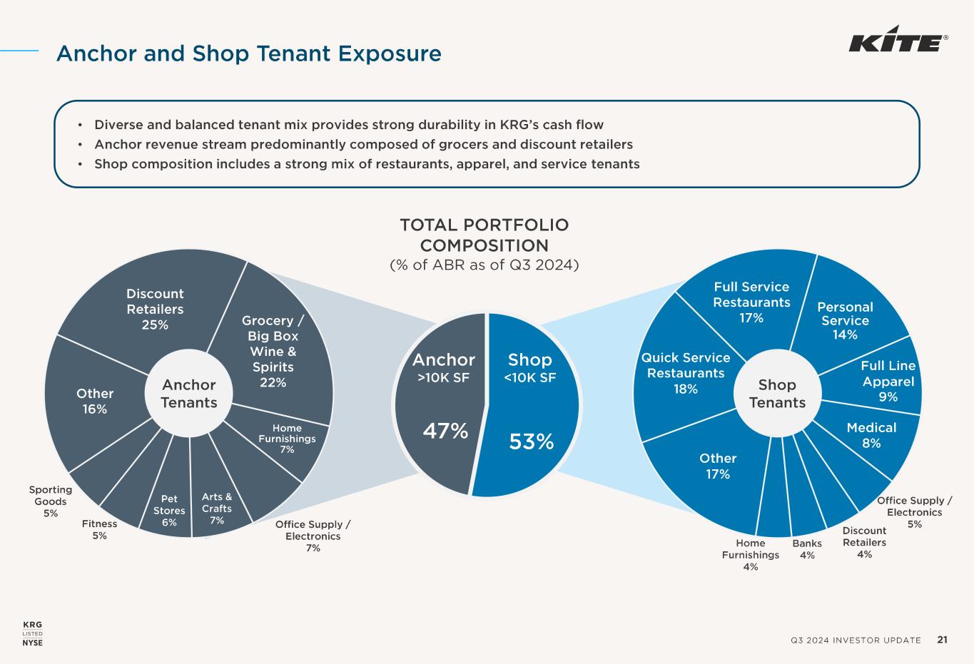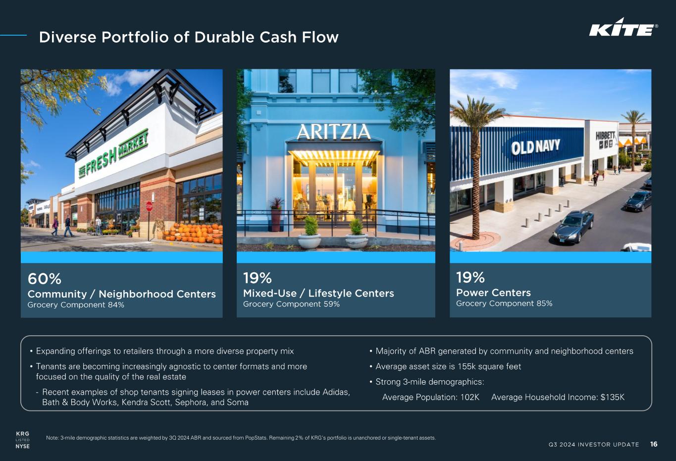 Note: 3-mile demographic statistics are weighted by 3Q 2024 ABR and sourced from PopStats. Remaining 2% of KRG’s portfolio is unanchored or single-tenant assets. • • • • •