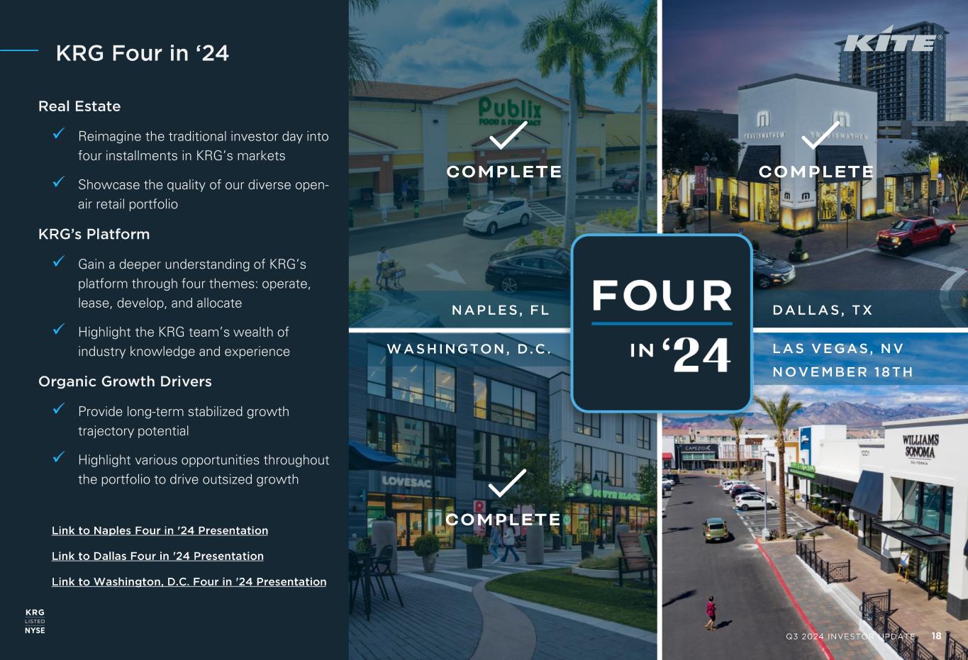 ✓ Reimagine the traditional investor day into four installments in KRG’s markets ✓ Showcase the quality of our diverse open- air retail portfolio ✓ Gain a deeper understanding of KRG’s platform through four themes: operate, lease, develop, and allocate ✓ Highlight the KRG team’s wealth of industry knowledge and experience ✓ Provide long-term stabilized growth trajectory potential ✓ Highlight various opportunities throughout the portfolio to drive outsized growth