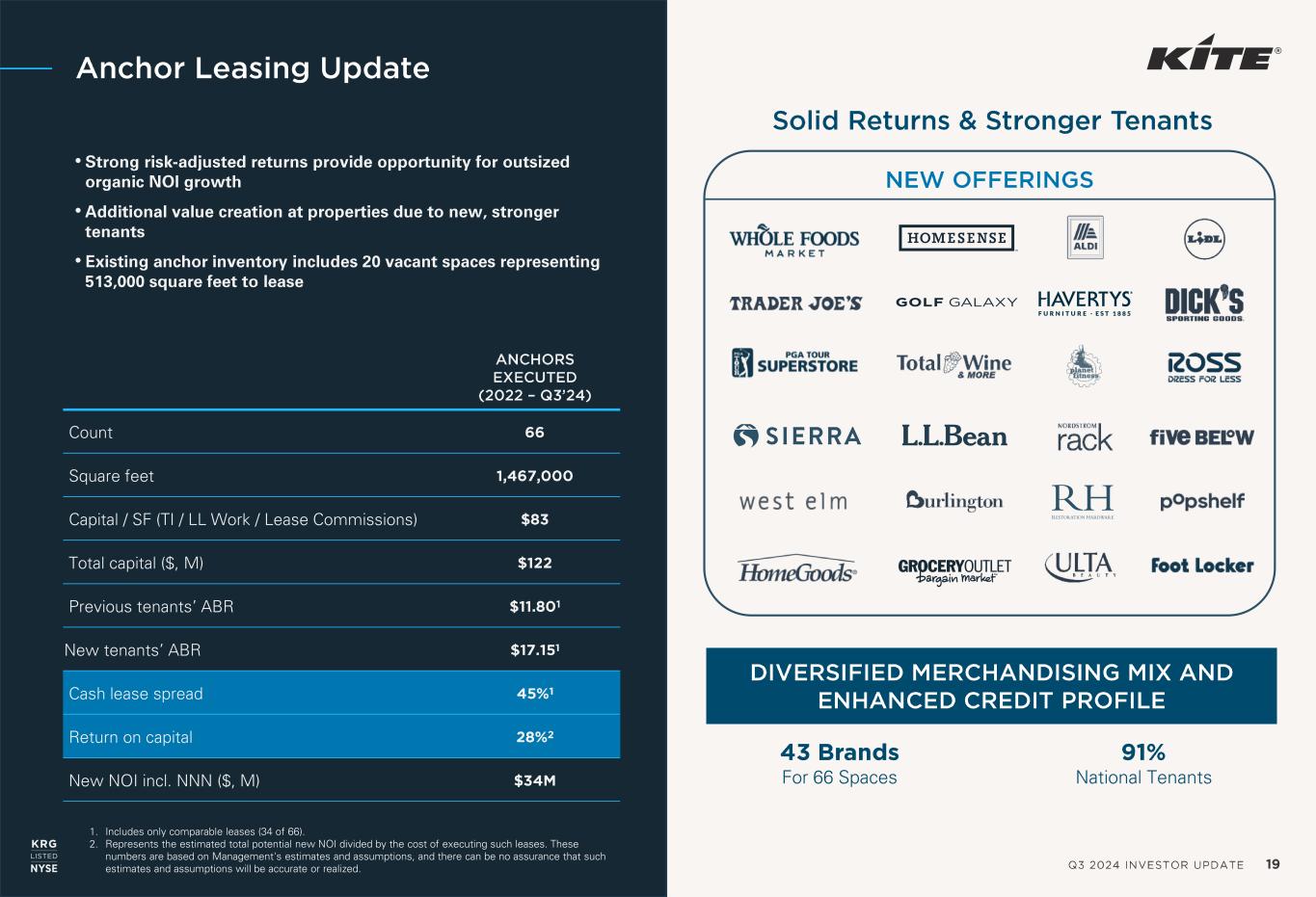 1. Includes only comparable leases (34 of 66). 2. Represents the estimated total potential new NOI divided by the cost of executing such leases. These numbers are based on Management's estimates and assumptions, and there can be no assurance that such estimates and assumptions will be accurate or realized. • • • Count Square feet Capital / SF (TI / LL Work / Lease Commissions) Total capital ($, M) Previous tenants’ ABR New tenants’ ABR Cash lease spread Return on capital New NOI incl. NNN ($, M) For 66 Spaces National Tenants