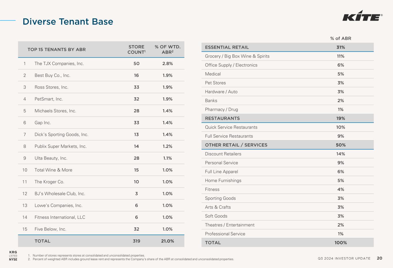 1. Number of stores represents stores at consolidated and unconsolidated properties. 2. Percent of weighted ABR includes ground lease rent and represents the Company’s share of the ABR at consolidated and unconsolidated properties. 1 The TJX Companies, Inc. 2 Best Buy Co., Inc. 3 Ross Stores, Inc. 4 PetSmart, Inc. 5 Michaels Stores, Inc. 6 Gap Inc. 7 Dick’s Sporting Goods, Inc. 8 Publix Super Markets, Inc. 9 Ulta Beauty, Inc. 10 Total Wine & More 11 The Kroger Co. 12 BJ’s Wholesale Club, Inc. 13 Lowe’s Companies, Inc. 14 Fitness International, LLC 15 Five Below, Inc. Grocery / Big Box Wine & Spirits Office Supply / Electronics Medical Pet Stores Hardware / Auto Banks Pharmacy / Drug Quick Service Restaurants Full Service Restaurants Discount Retailers Personal Service Full Line Apparel Home Furnishings Fitness Sporting Goods Arts & Crafts Soft Goods Theatres / Entertainment Professional Service