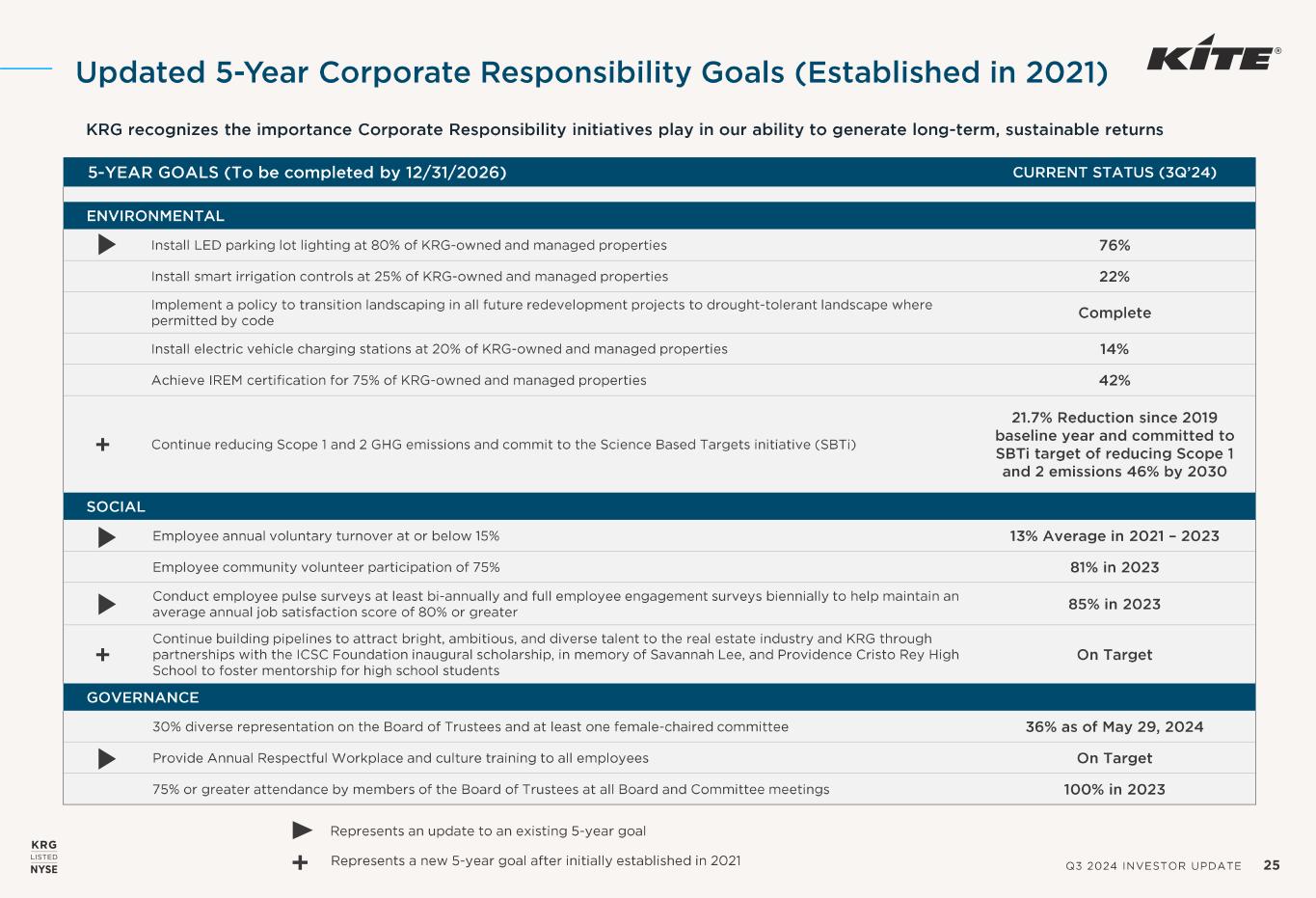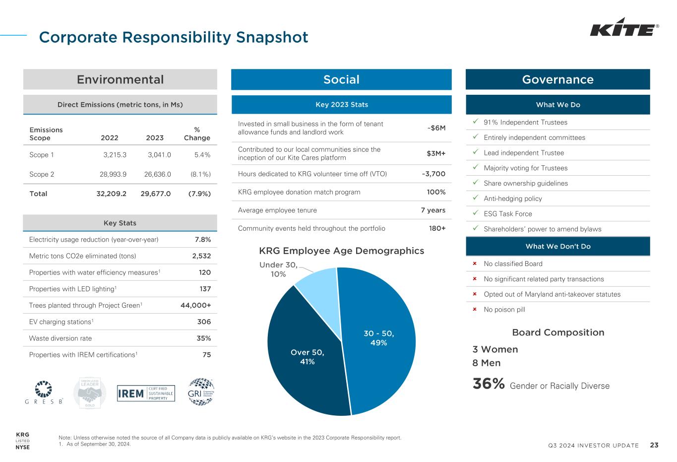 Scope 1 3,215.3 3,041.0 5.4% Scope 2 28,993.9 26,636.0 (8.1%) Electricity usage reduction (year-over-year) Metric tons CO2e eliminated (tons) Properties with water efficiency measures1 Properties with LED lighting1 Trees planted through Project Green1 EV charging stations1 Waste diversion rate Properties with IREM certifications1 Invested in small business in the form of tenant allowance funds and landlord work Contributed to our local communities since the inception of our Kite Cares platform Hours dedicated to KRG volunteer time off (VTO) KRG employee donation match program Average employee tenure Community events held throughout the portfolio ✓ 91% Independent Trustees ✓ Entirely independent committees ✓ Lead independent Trustee ✓ Majority voting for Trustees ✓ Share ownership guidelines ✓ Anti-hedging policy ✓ ESG Task Force ✓ Shareholders’ power to amend bylaws  No classified Board  No significant related party transactions  Opted out of Maryland anti-takeover statutes  No poison pill Note: Unless otherwise noted the source of all Company data is publicly available on KRG’s website in the 2023 Corporate Responsibility report. 1. As of September 30, 2024.