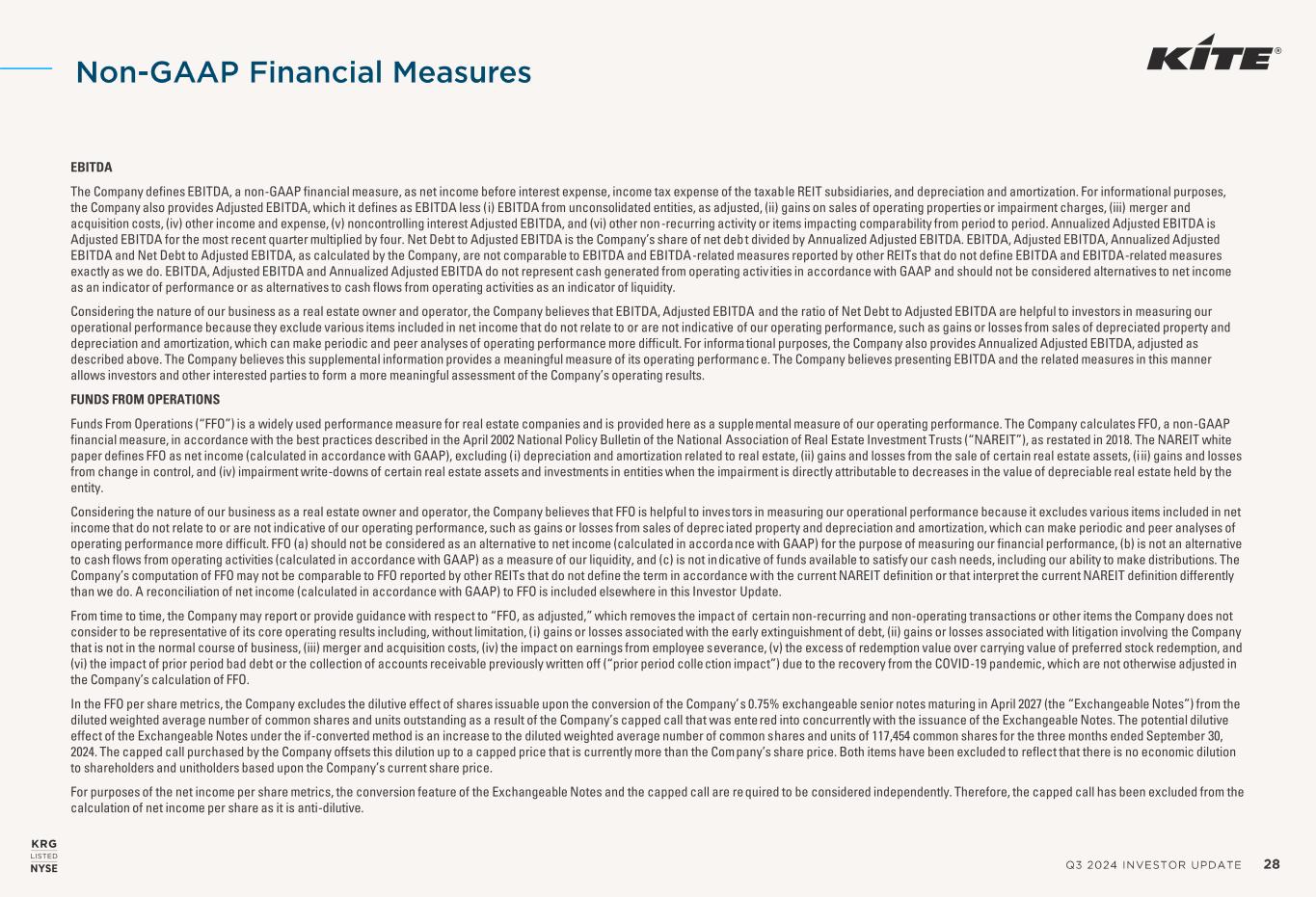 EBITDA The Company defines EBITDA, a non-GAAP financial measure, as net income before interest expense, income tax expense of the taxable REIT subsidiaries, and depreciation and amortization. For informational purposes, the Company also provides Adjusted EBITDA, which it defines as EBITDA less (i) EBITDA from unconsolidated entities, as adjusted, (ii) gains on sales of operating properties or impairment charges, (iii) merger and acquisition costs, (iv) other income and expense, (v) noncontrolling interest Adjusted EBITDA, and (vi) other non-recurring activity or items impacting comparability from period to period. Annualized Adjusted EBITDA is Adjusted EBITDA for the most recent quarter multiplied by four. Net Debt to Adjusted EBITDA is the Company’s share of net deb t divided by Annualized Adjusted EBITDA. EBITDA, Adjusted EBITDA, Annualized Adjusted EBITDA and Net Debt to Adjusted EBITDA, as calculated by the Company, are not comparable to EBITDA and EBITDA-related measures reported by other REITs that do not define EBITDA and EBITDA-related measures exactly as we do. EBITDA, Adjusted EBITDA and Annualized Adjusted EBITDA do not represent cash generated from operating activ ities in accordance with GAAP and should not be considered alternatives to net income as an indicator of performance or as alternatives to cash flows from operating activities as an indicator of liquidity. Considering the nature of our business as a real estate owner and operator, the Company believes that EBITDA, Adjusted EBITDA and the ratio of Net Debt to Adjusted EBITDA are helpful to investors in measuring our operational performance because they exclude various items included in net income that do not relate to or are not indicative of our operating performance, such as gains or losses from sales of depreciated property and depreciation and amortization, which can make periodic and peer analyses of operating performance more difficult. For informational purposes, the Company also provides Annualized Adjusted EBITDA, adjusted as described above. The Company believes this supplemental information provides a meaningful measure of its operating performance. The Company believes presenting EBITDA and the related measures in this manner allows investors and other interested parties to form a more meaningful assessment of the Company’s operating results. FUNDS FROM OPERATIONS Funds From Operations (“FFO”) is a widely used performance measure for real estate companies and is provided here as a supplemental measure of our operating performance. The Company calculates FFO, a non-GAAP financial measure, in accordance with the best practices described in the April 2002 National Policy Bulletin of the National Association of Real Estate Investment Trusts (“NAREIT”), as restated in 2018. The NAREIT white paper defines FFO as net income (calculated in accordance with GAAP), excluding (i) depreciation and amortization related to real estate, (ii) gains and losses from the sale of certain real estate assets, (i ii) gains and losses from change in control, and (iv) impairment write-downs of certain real estate assets and investments in entities when the impairment is directly attributable to decreases in the value of depreciable real estate held by the entity. Considering the nature of our business as a real estate owner and operator, the Company believes that FFO is helpful to investors in measuring our operational performance because it excludes various items included in net income that do not relate to or are not indicative of our operating performance, such as gains or losses from sales of depreciated property and depreciation and amortization, which can make periodic and peer analyses of operating performance more difficult. FFO (a) should not be considered as an alternative to net income (calculated in accordance with GAAP) for the purpose of measuring our financial performance, (b) is not an alternative to cash flows from operating activities (calculated in accordance with GAAP) as a measure of our liquidity, and (c) is not indicative of funds available to satisfy our cash needs, including our ability to make distributions. The Company’s computation of FFO may not be comparable to FFO reported by other REITs that do not define the term in accordance w ith the current NAREIT definition or that interpret the current NAREIT definition differently than we do. A reconciliation of net income (calculated in accordance with GAAP) to FFO is included elsewhere in this Investor Update. From time to time, the Company may report or provide guidance with respect to “FFO, as adjusted,” which removes the impact of certain non-recurring and non-operating transactions or other items the Company does not consider to be representative of its core operating results including, without limitation, (i) gains or losses associated with the early extinguishment of debt, (ii) gains or losses associated with litigation involving the Company that is not in the normal course of business, (iii) merger and acquisition costs, (iv) the impact on earnings from employee severance, (v) the excess of redemption value over carrying value of preferred stock redemption, and (vi) the impact of prior period bad debt or the collection of accounts receivable previously written off (“prior period collection impact”) due to the recovery from the COVID-19 pandemic, which are not otherwise adjusted in the Company’s calculation of FFO. In the FFO per share metrics, the Company excludes the dilutive effect of shares issuable upon the conversion of the Company’s 0.75% exchangeable senior notes maturing in April 2027 (the “Exchangeable Notes”) from the diluted weighted average number of common shares and units outstanding as a result of the Company’s capped call that was ente red into concurrently with the issuance of the Exchangeable Notes. The potential dilutive effect of the Exchangeable Notes under the if-converted method is an increase t