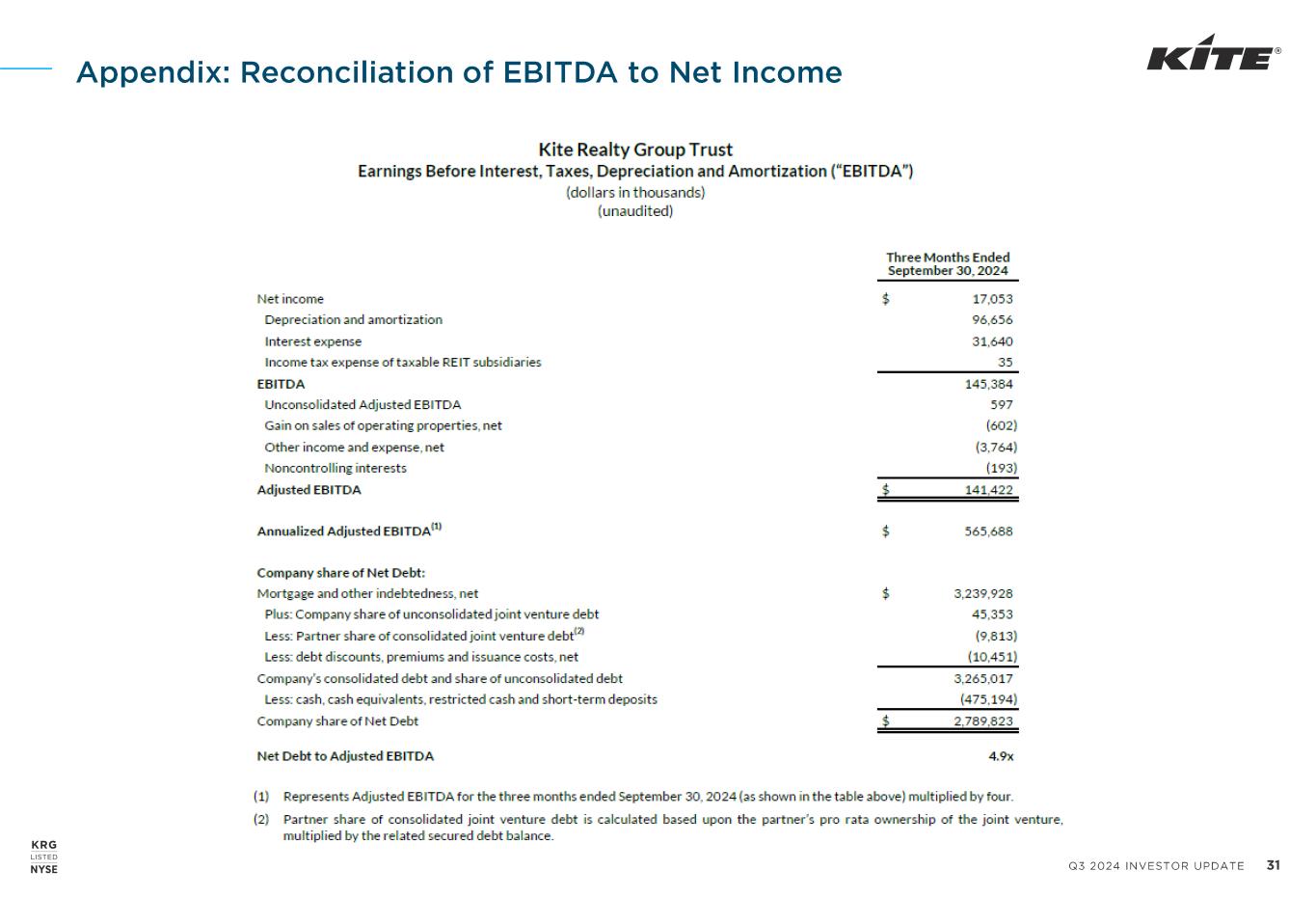 Note: Source of all peer data is from 3Q 2024 supplemental disclosures, except FRT and KIM data is from 2Q 2024 supplemental disclosures. 1. Includes $45.4 million of the Company’s unconsolidated JV debt. Net Debt + Preferred / Adjusted EBITDA Debt Service Coverage Ratio Available Liquidity Weighted Average Interest Rate1 Unencumbered NOI as a % of Total NOI Fixed Rate Debt Fitch S&P Moody’s 5.1x 5.2x 5.6x 5.7x 6.0x 6.0x 6.3x KRG PECO REG KIM BRX FRT AKR ROIC