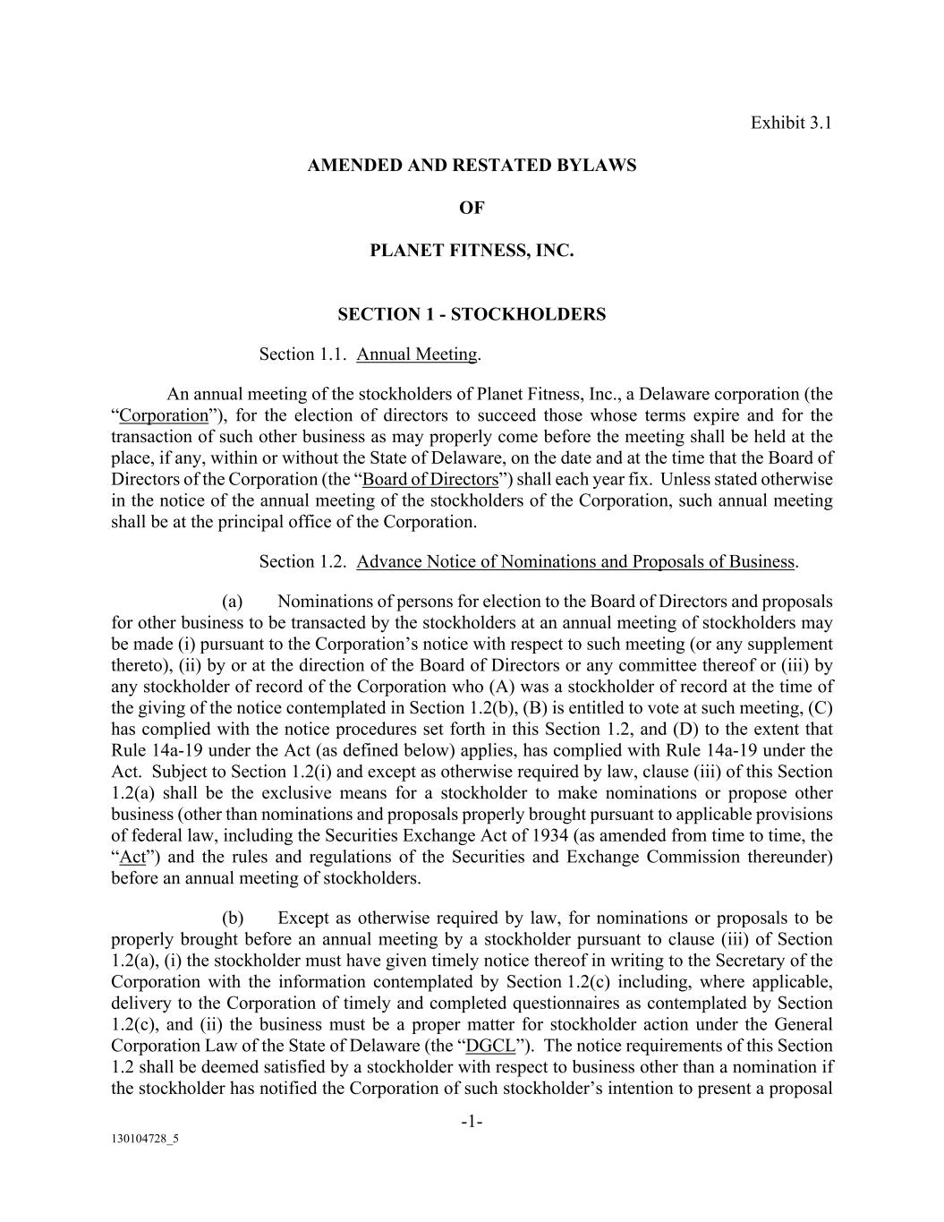 -1- 130104728_5 Exhibit 3.1 AMENDED AND RESTATED BYLAWS OF PLANET FITNESS, INC. SECTION 1 - STOCKHOLDERS Section 1.1. Annual Meeting. An annual meeting of the stockholders of Planet Fitness, Inc., a Delaware corporation (the “Corporation”), for the election of directors to succeed those whose terms expire and for the transaction of such other business as may properly come before the meeting shall be held at the place, if any, within or without the State of Delaware, on the date and at the time that the Board of Directors of the Corporation (the “Board of Directors”) shall each year fix. Unless stated otherwise in the notice of the annual meeting of the stockholders of the Corporation, such annual meeting shall be at the principal office of the Corporation. Section 1.2. Advance Notice of Nominations and Proposals of Business. (a) Nominations of persons for election to the Board of Directors and proposals for other business to be transacted by the stockholders at an annual meeting of stockholders may be made (i) pursuant to the Corporation’s notice with respect to such meeting (or any supplement thereto), (ii) by or at the direction of the Board of Directors or any committee thereof or (iii) by any stockholder of record of the Corporation who (A) was a stockholder of record at the time of the giving of the notice contemplated in Section 1.2(b), (B) is entitled to vote at such meeting, (C) has complied with the notice procedures set forth in this Section 1.2, and (D) to the extent that Rule 14a-19 under the Act (as defined below) applies, has complied with Rule 14a-19 under the Act. Subject to Section 1.2(i) and except as otherwise required by law, clause (iii) of this Section 1.2(a) shall be the exclusive means for a stockholder to make nominations or propose other business (other than nominations and proposals properly brought pursuant to applicable provisions of federal law, including the Securities Exchange Act of 1934 (as amended from time to time, the “Act”) and the rules and regulations of the Securities and Exchange Commission thereunder) before an annual meeting of stockholders. (b) Except as otherwise required by law, for nominations or proposals to be properly brought before an annual meeting by a stockholder pursuant to clause (iii) of Section 1.2(a), (i) the stockholder must have given timely notice thereof in writing to the Secretary of the Corporation with the information contemplated by Section 1.2(c) including, where applicable, delivery to the Corporation of timely and completed questionnaires as contemplated by Section 1.2(c), and (ii) the business must be a proper matter for stockholder action under the General Corporation Law of the State of Delaware (the “DGCL”). The notice requirements of this Section 1.2 shall be deemed satisfied by a stockholder with respect to business other than a nomination if the stockholder has notified the Corporation of such stockholder’s intention to present a proposal